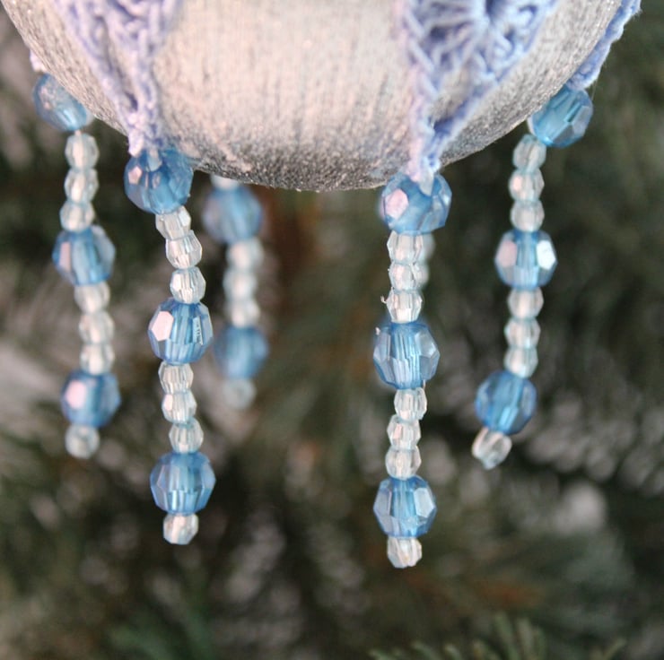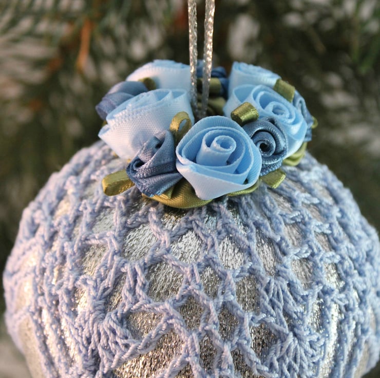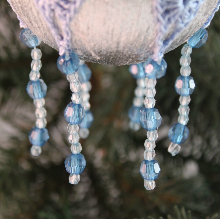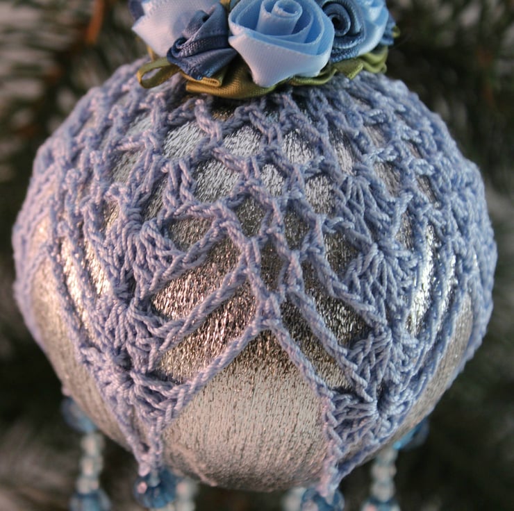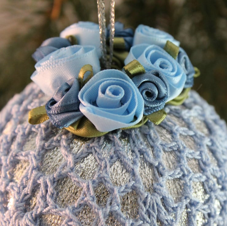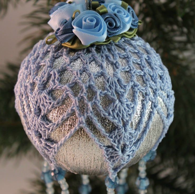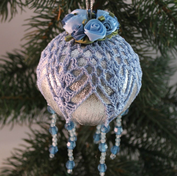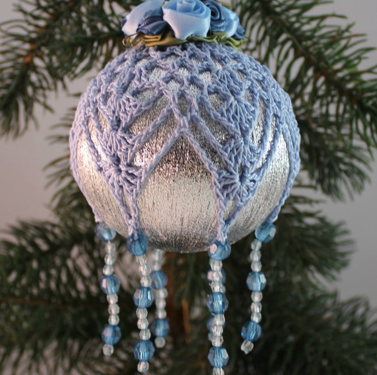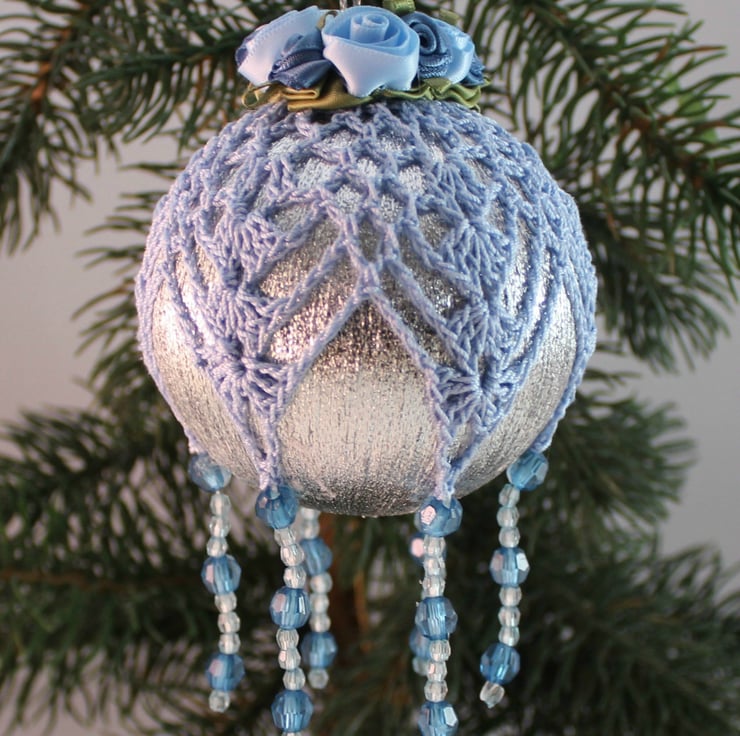 Discover the charm of this exquisite silver-coloured thread bauble, beautifully enhanced with intricate hand-crocheted pale blue lace. Topped with elegant blue ribbon satin roses, it features blue multi-faceted acrylic beads cascading from the lace points—an enchanting addition to your Christmas tree!