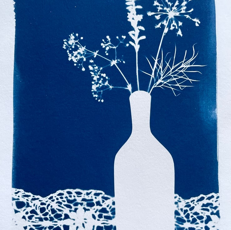 A vibrant blue cyanotype showing a still life of cottage garden flowers. In this original artwork, the flowers appear to burst with life from a small bottle shaped vase sitting on top of beautiful scalloped lace.