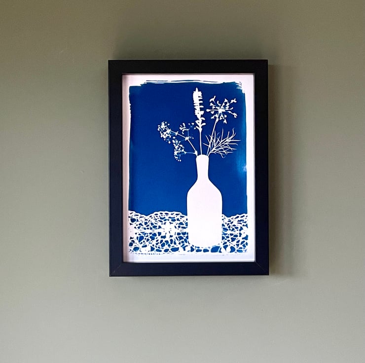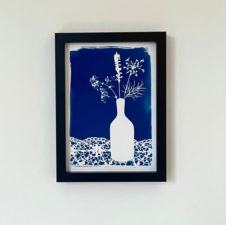 Cyanotypes are one of a kind prints as they are created by exposing light sensitive coated paper to sunlight - each print is affected not only by the composition of botanicals but also by the sunlight conditions.