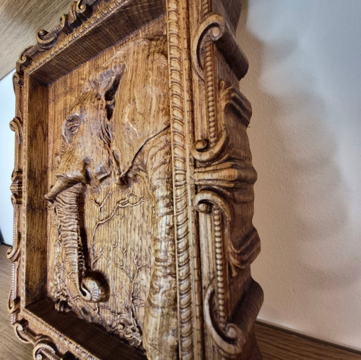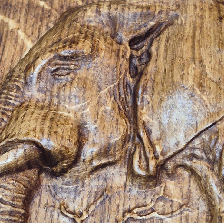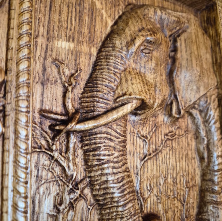 Carved wooden wall art featuring an elephant in relief, crafted from natural oak with hand-finished detailing. The bas-relief carving highlights the natural grain and texture of the wood, giving the artwork depth and character.