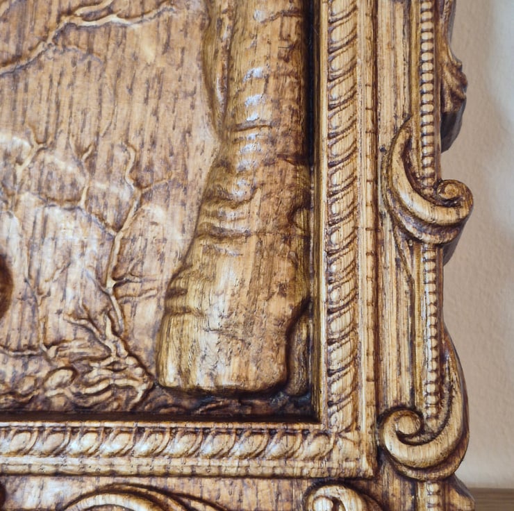 Set in an ornate carved frame, this piece has a classic and elegant appearance. It makes a thoughtful and unique gift and will beautifully enhance the interior of a home, office, or country house, adding warmth and distinctive style.