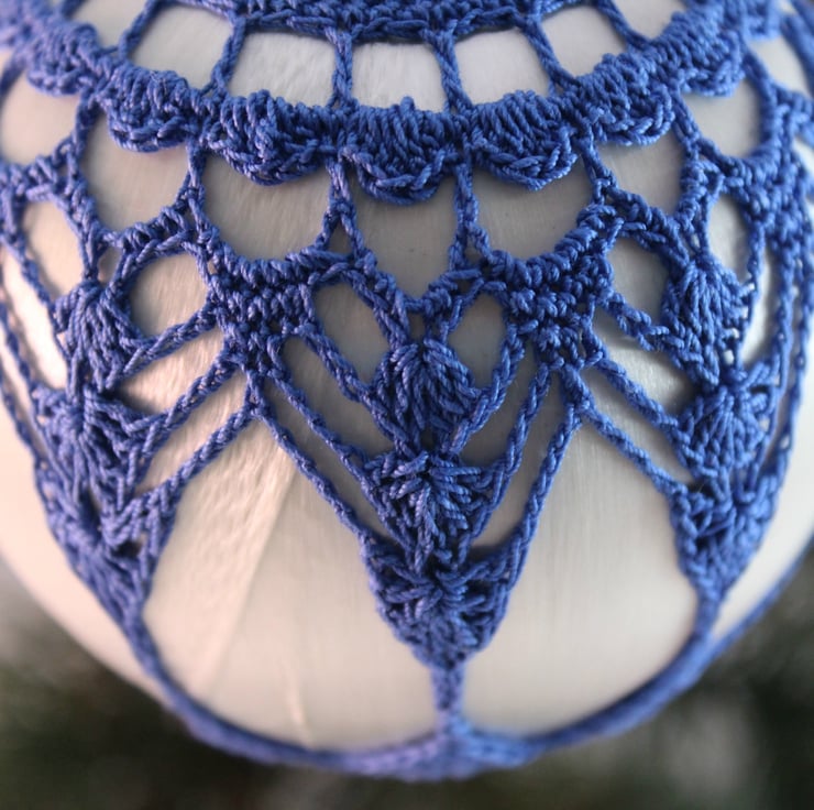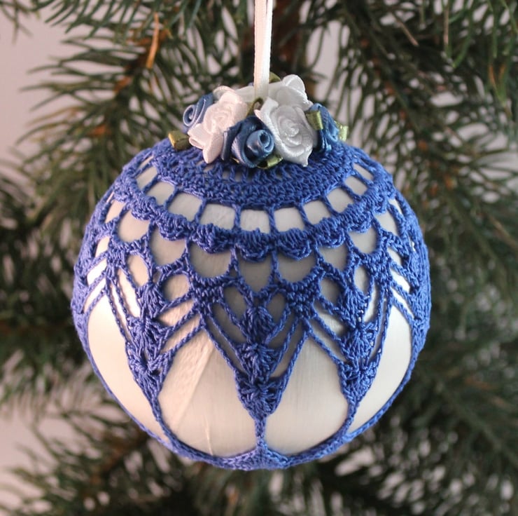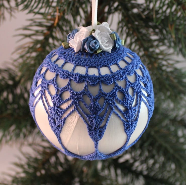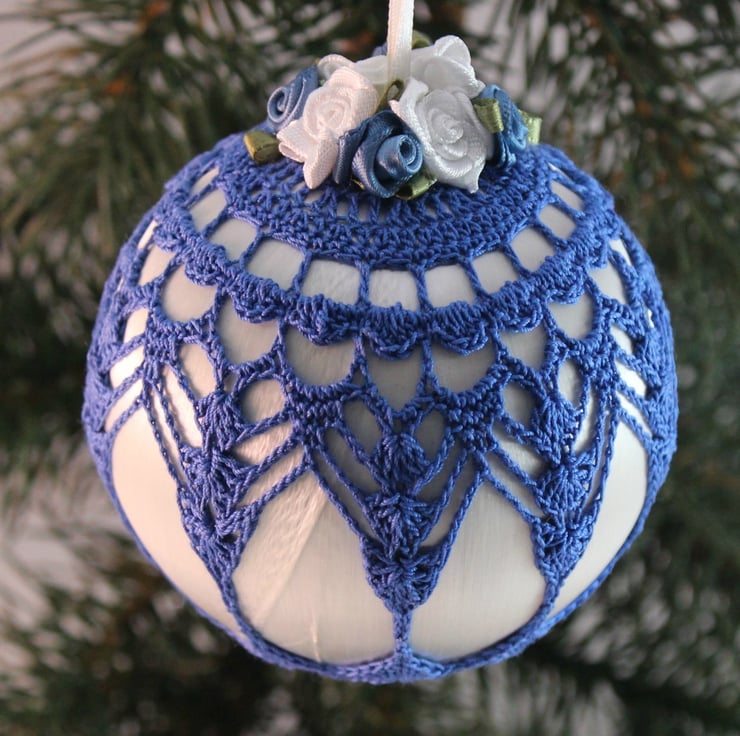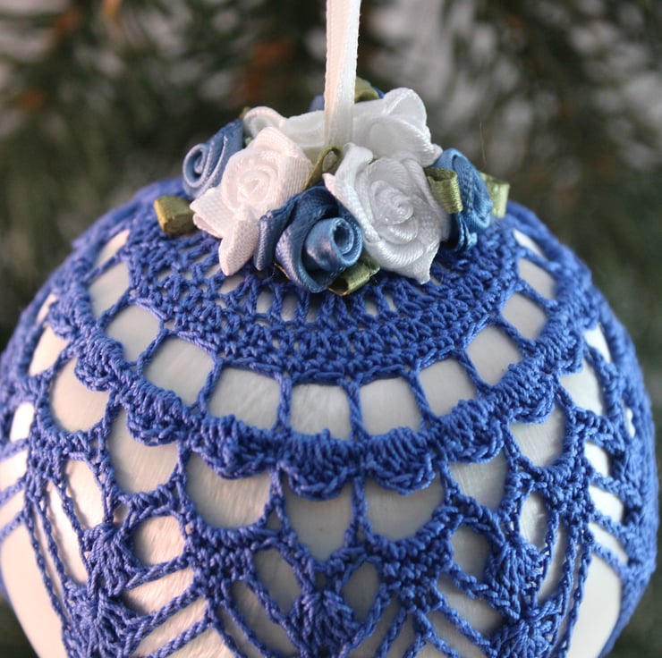 Discover the charm of this exquisite white-coloured thread bauble, beautifully enhanced with intricate hand-crocheted blue lace and topped with elegant blue and white satin roses —an enchanting addition to your Christmas tree!