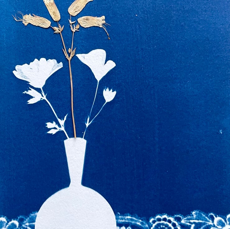 Cyanotypes are one of a kind prints as they are created by exposing light sensitive coated paper to sunlight - each print is affected not only by the composition of botanicals but also by the sunlight conditions.