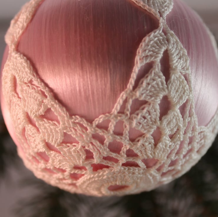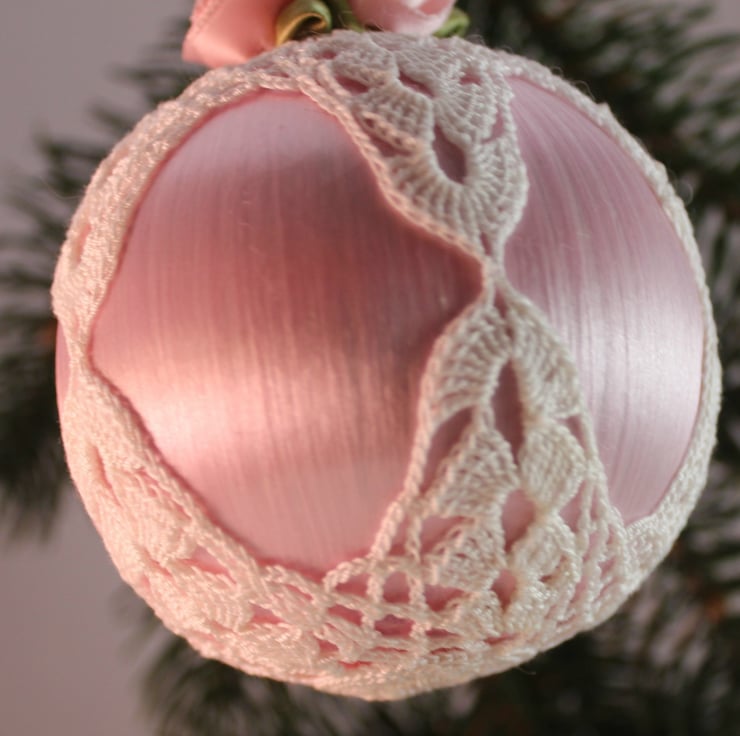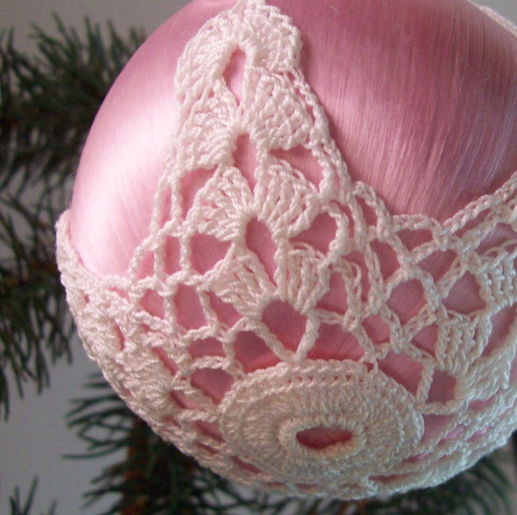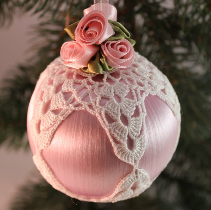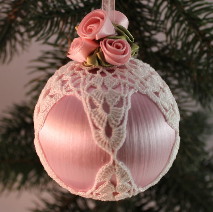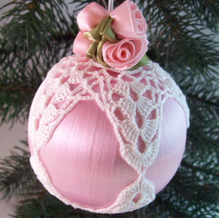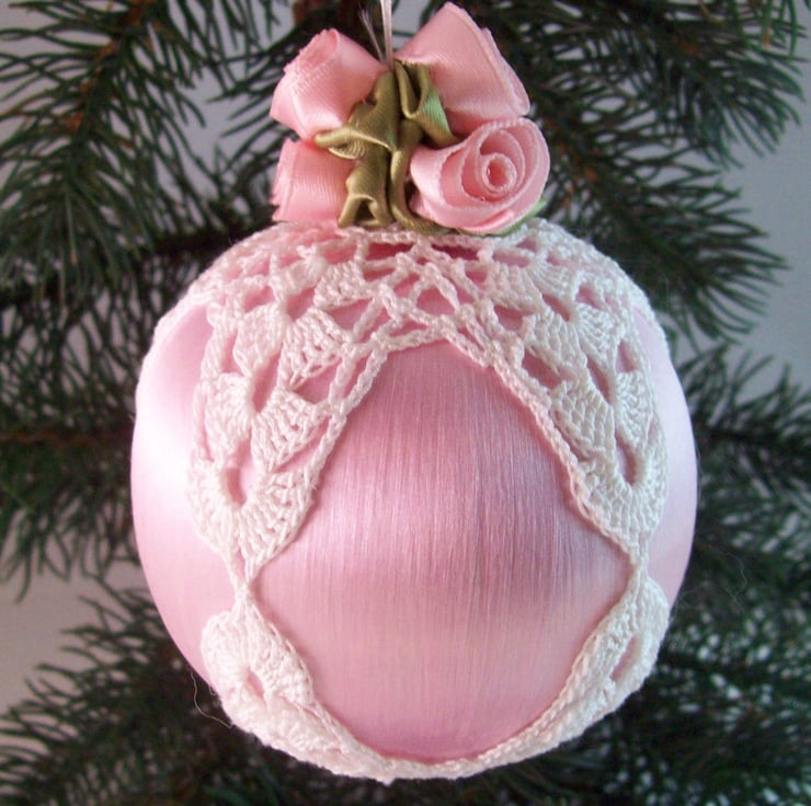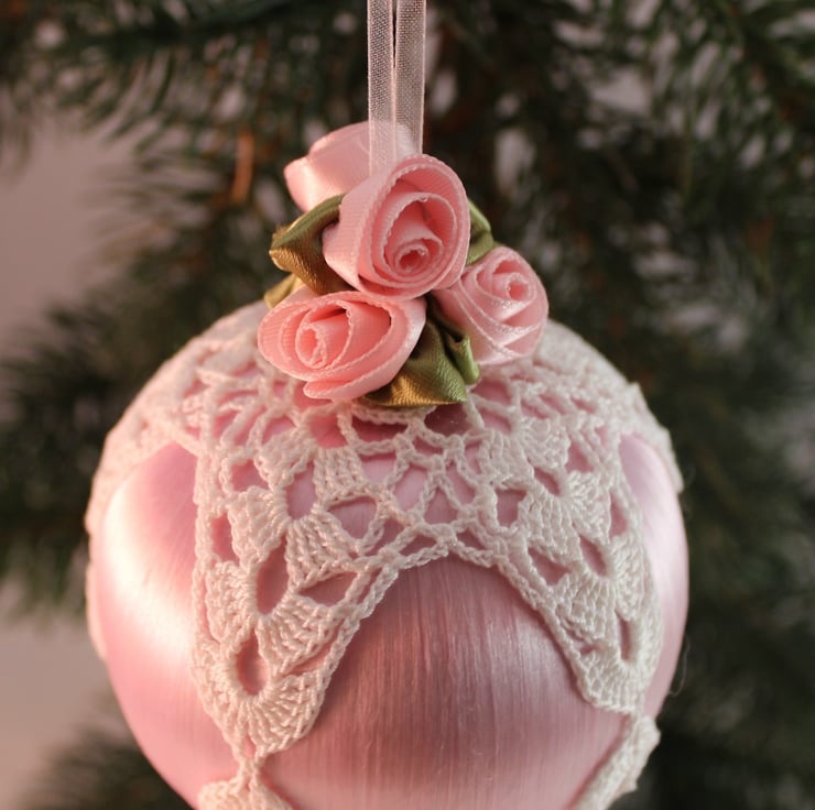 Discover the charm of this exquisite pink-coloured thread bauble, beautifully enhanced with intricate hand-crocheted white lace and topped with elegant pink satin roses —an enchanting addition to your Christmas tree!