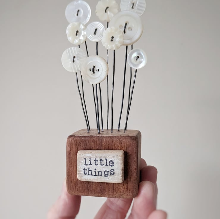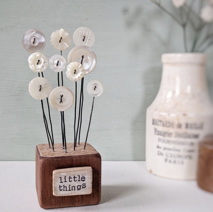 Standing on their wire stalks in a decoupaged wooden block an array of mother of pearl button flowers.
