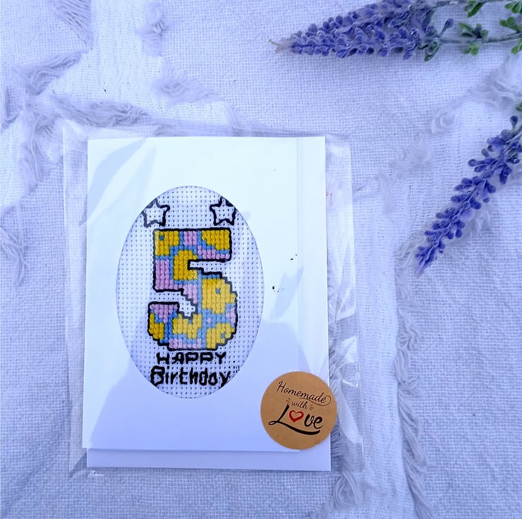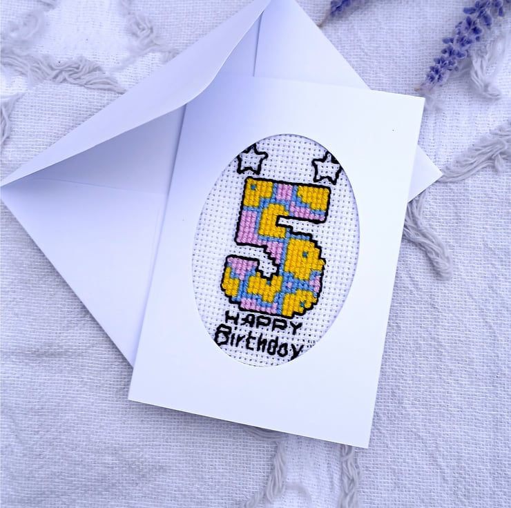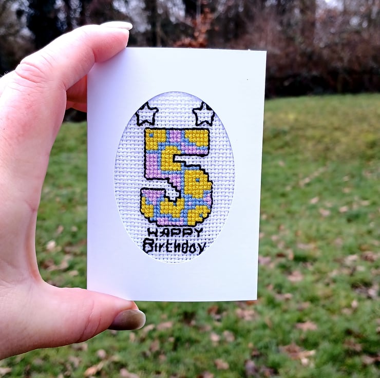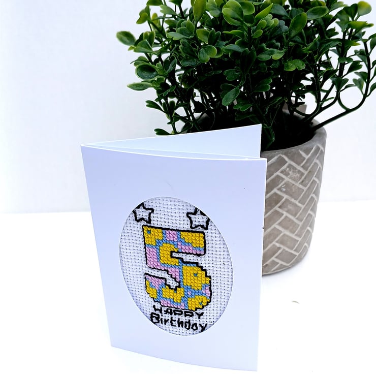 Handmade Cross Stitch 5th Birthday Card Featuring Colourful Embroidered