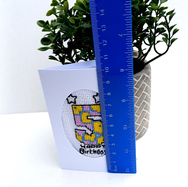 Celebrate a fifth birthday with this beautiful handmade cross stitch card. The design features a meticulously hand embroidered number five with a vibrant yellow purple and blue geometric pattern. Two small stitched stars and the words Happy Birthday complete this unique piece of art.