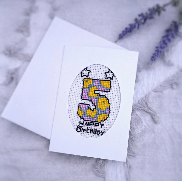 The embroidery is created on high quality white Aida fabric and set within a premium white cardstock oval window. This card is perfect for a child or grandchild reaching their five year milestone. It can even be framed afterwards as a special nursery keepsake.