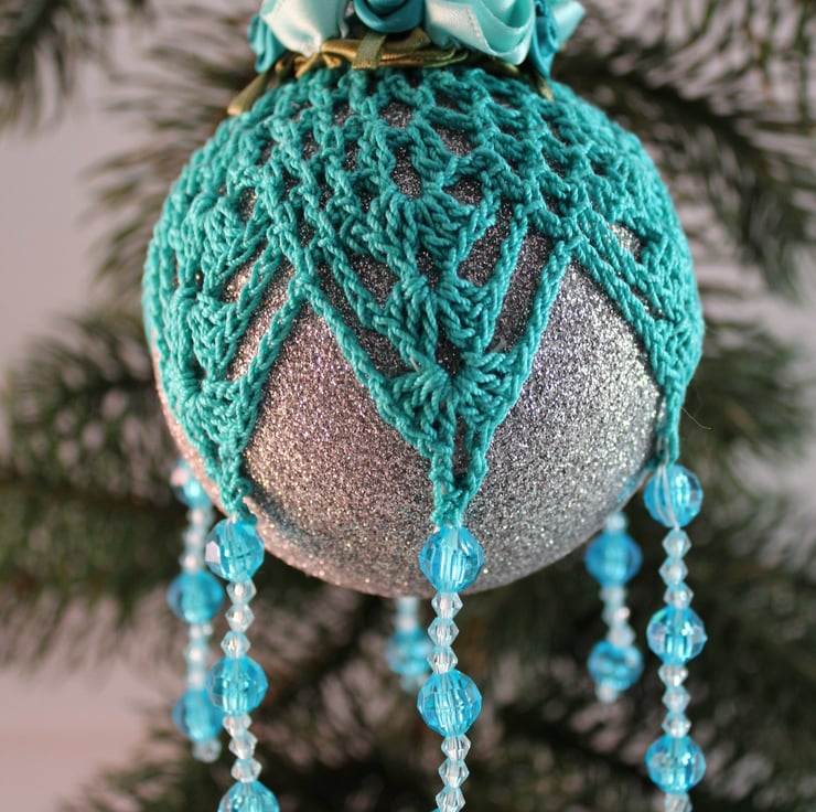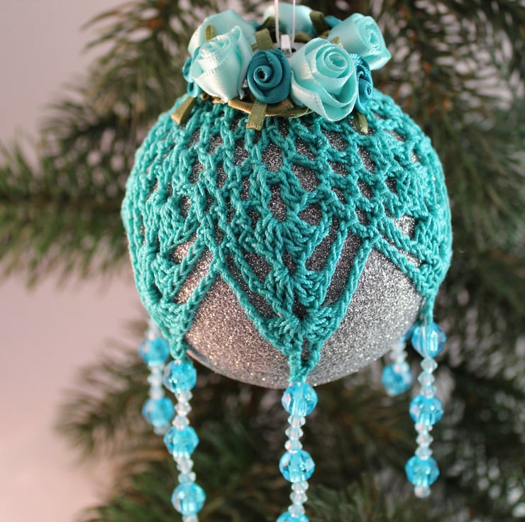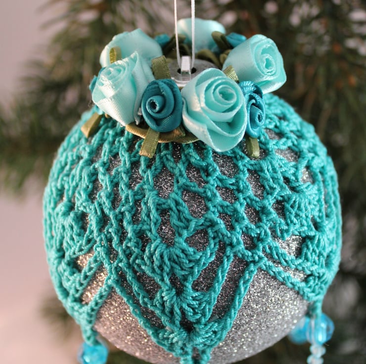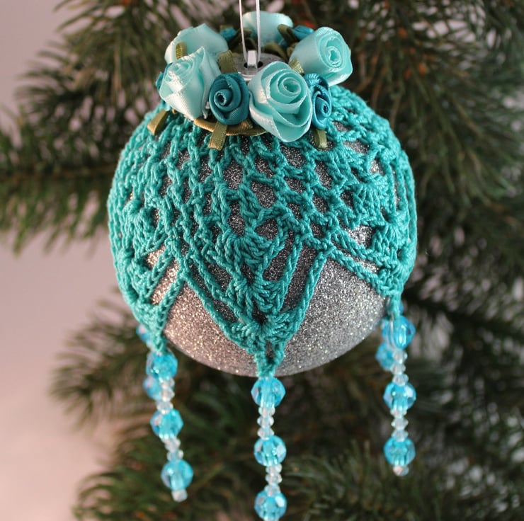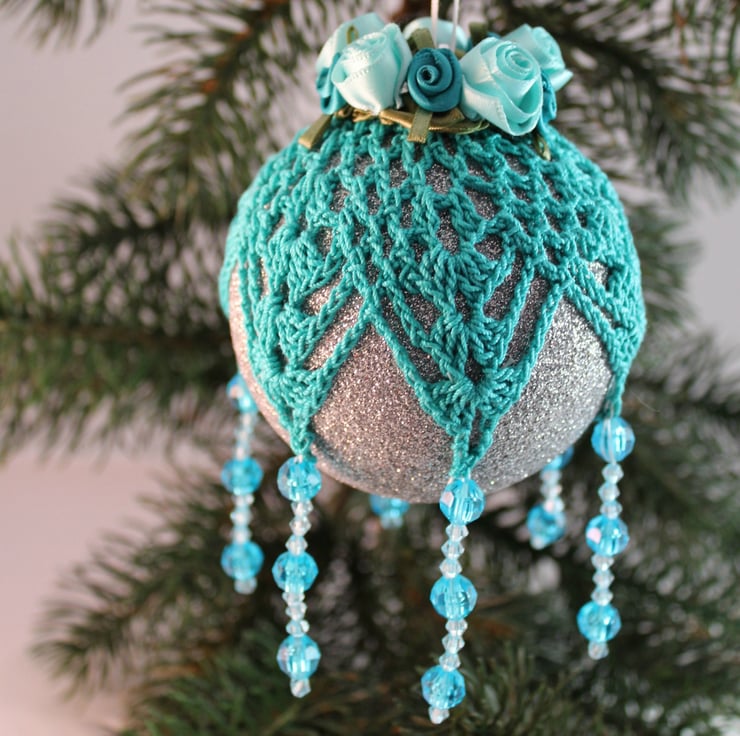 Discover the charm of this exquisite glittery silver bauble, beautifully enhanced with intricate hand-crocheted teal lace. Topped with elegant teal and aqua satin roses, it features vibrant light and dark teal multi-faceted acrylic beads cascading from the lace points—an enchanting addition to your Christmas tree!