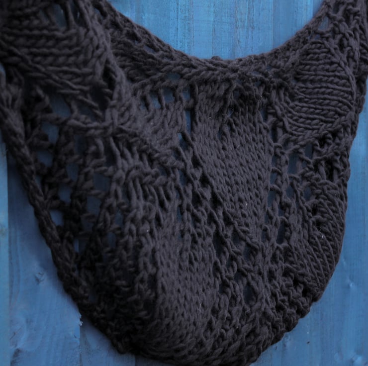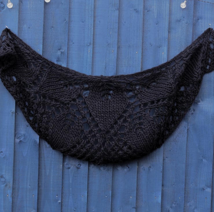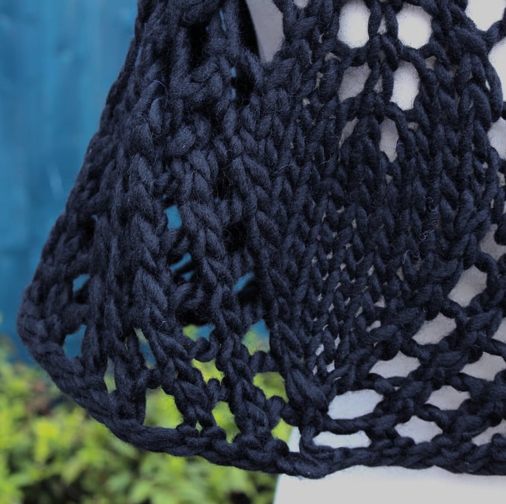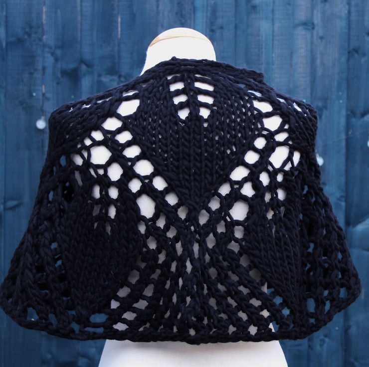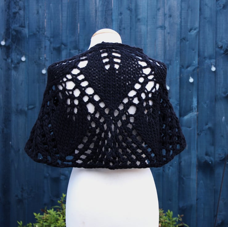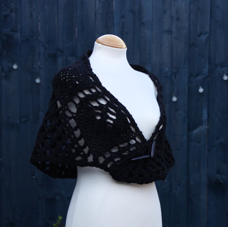 his practical waist-length capelet, featuring seven leaves, has been lovingly hand-knit using high-quality commercially produced 100% wool yarn in black. Its elegant crescent shape wraps beautifully around your shoulders, providing both warmth and style. The thoughtful design features a versatile double-ended toggle button, allowing you to secure the capelet exactly to your preference. You can also choose to fasten it gracefully over your arms, then underneath, with the tips elegantly securing around your mid-back to create charming sleeves. This capelet not only adds a touch of sophistication to any outfit, but it also offers a cosy embrace that you will enjoy wearing on various occasions.