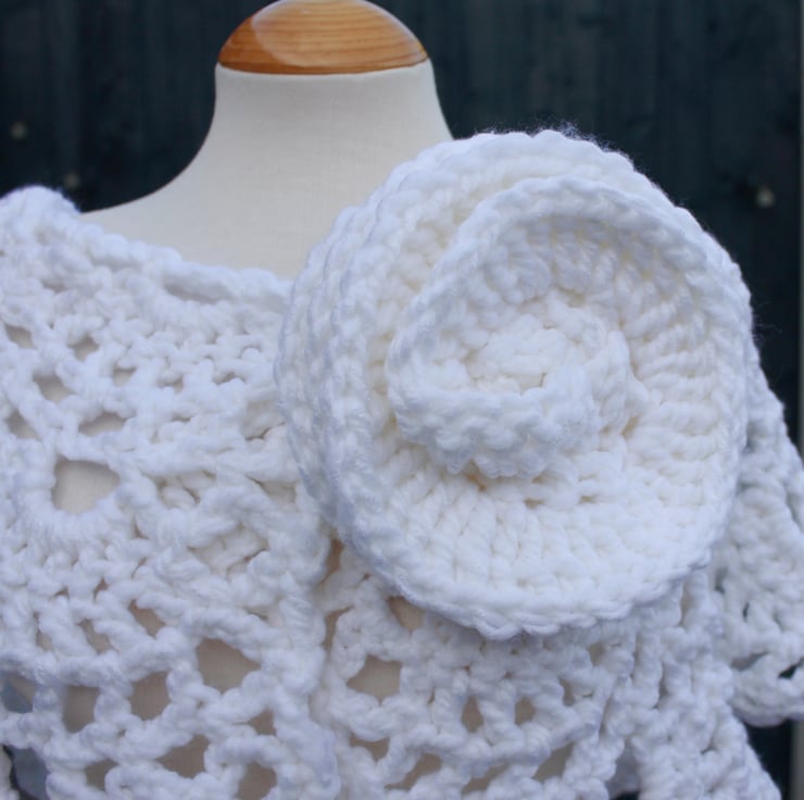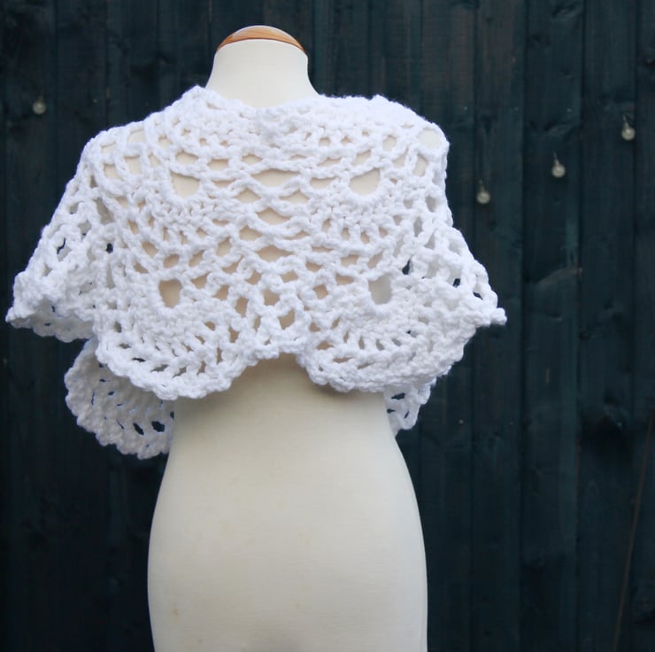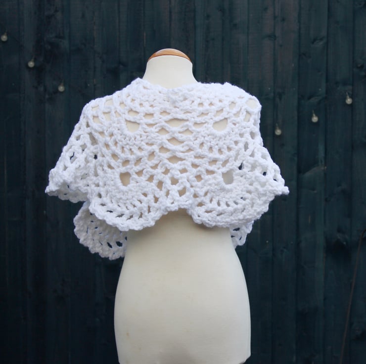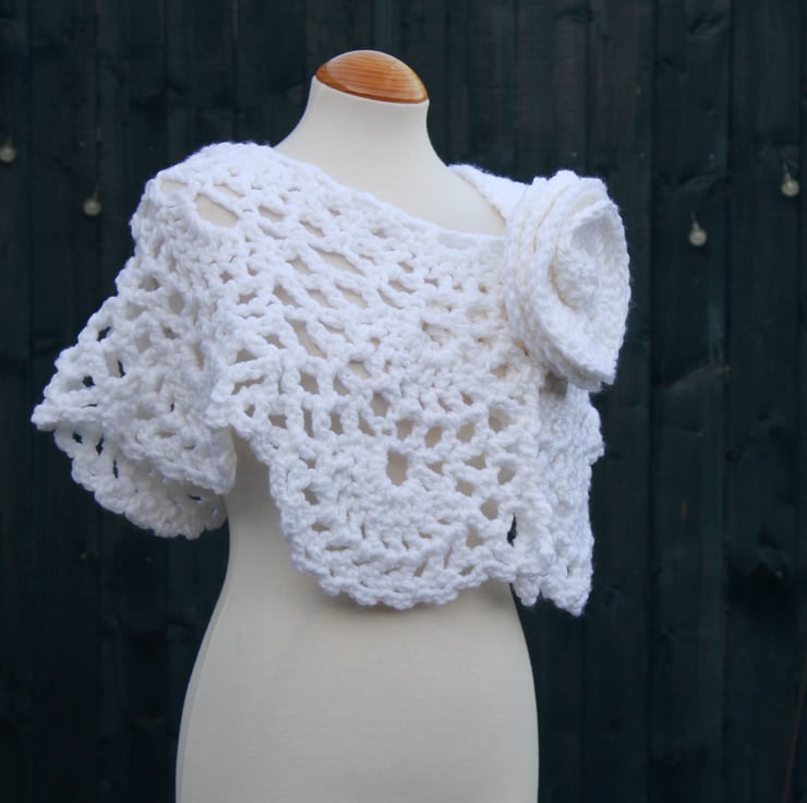 This is a lovely wrap that I have hand-crocheted using a quality commercially produced 100% acrylic yarn in white. The design features scalloped waves of lace and includes a matching oversized flower brooch for added flair.