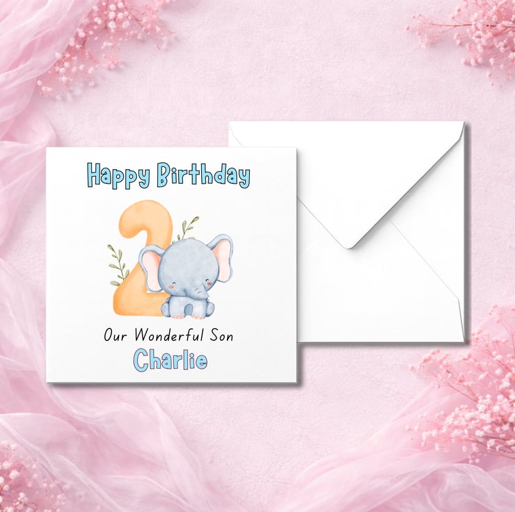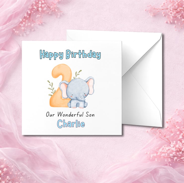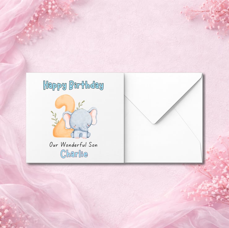 This adorable personalised elephant birthday card is perfect for celebrating a special second birthday. The design features a cute watercolour elephant with a soft orange number, making it ideal for little boys and animal lovers.