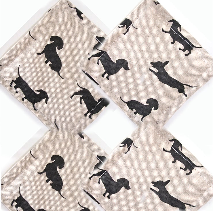So many ways to spell this cute breed! - Weiner Dogs / Dachsund / Dachsunds / Daschund / Daschunds / Dachshund / Dachshunds Puppy Dogs in Black on a Linen Beige Background.