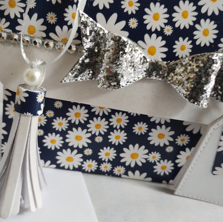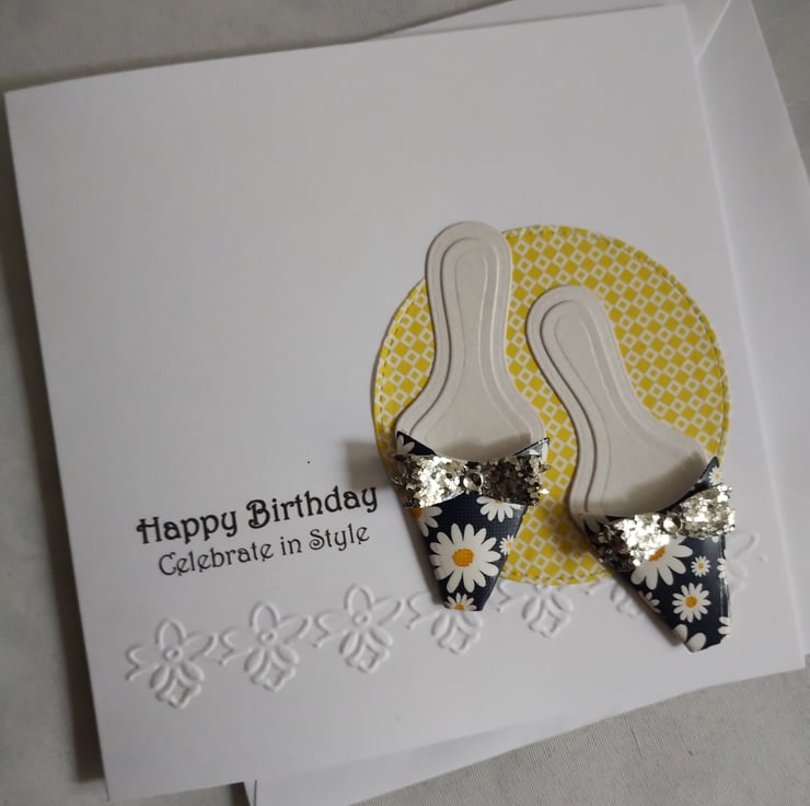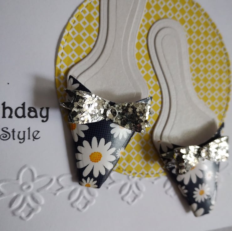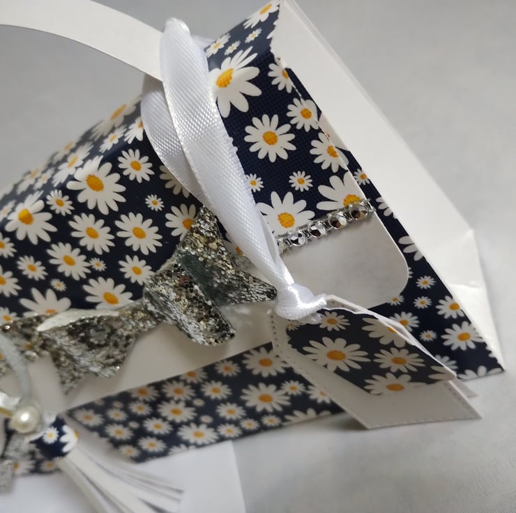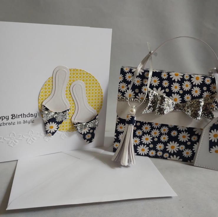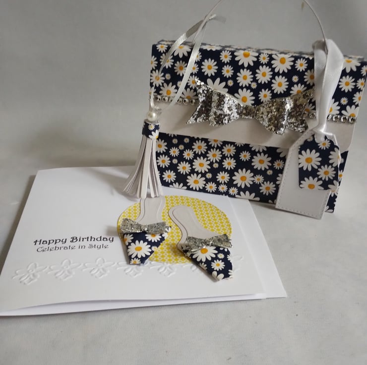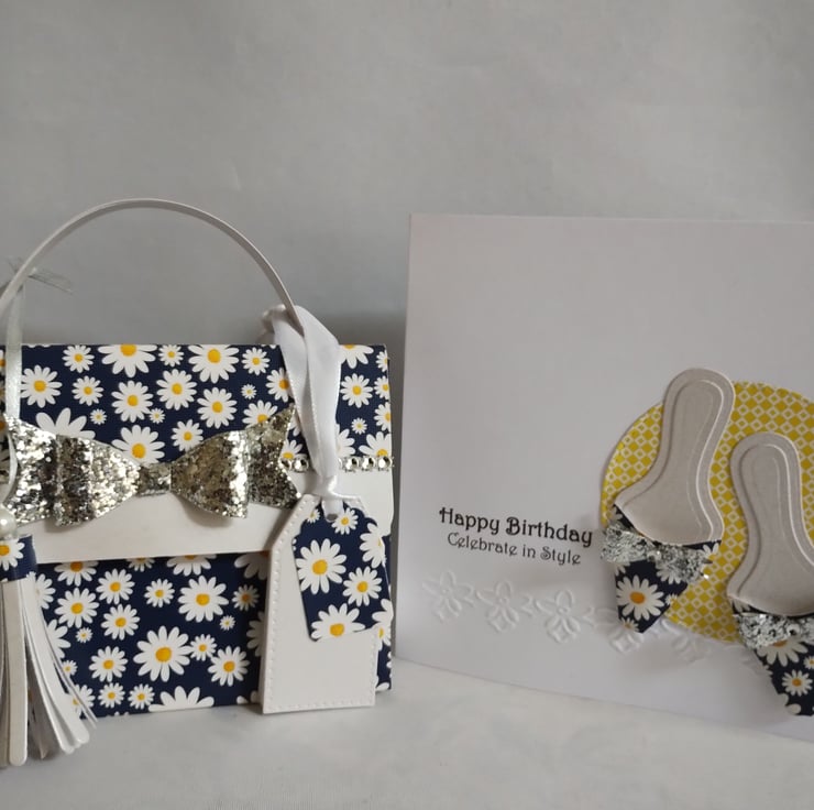 This co-ordinated gift giving set comprises of a beautiful small handbag style gift box and a matching card featuring 3d shoes made with the same gorgeous daisy patterned premium cardstock.