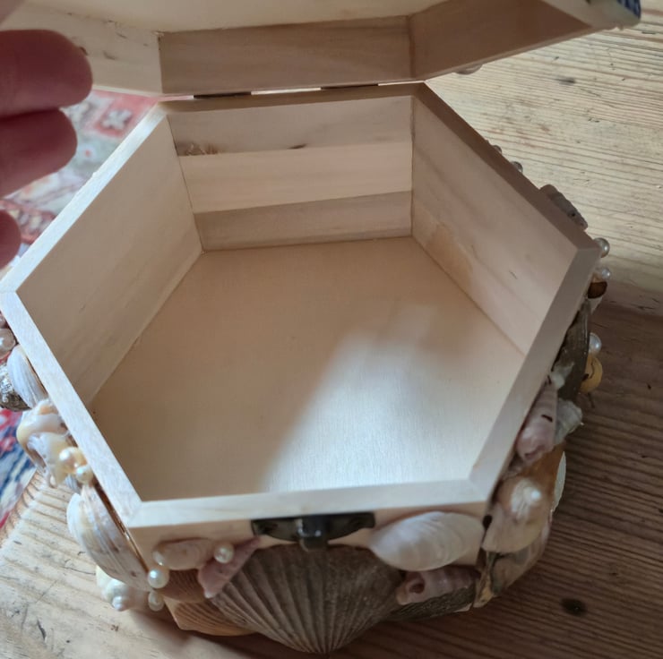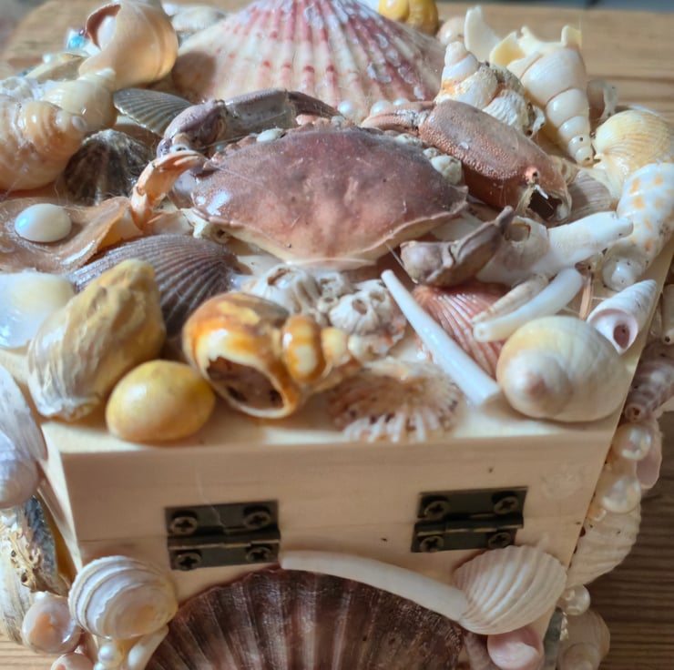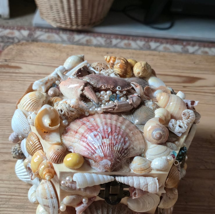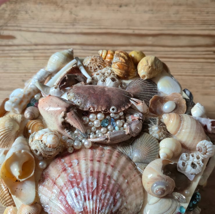 The crab shell on top is a cast off from a crab getting too big for its shell, no creatures harmed in the making of this shell box!! Glass pearl beads finish off this crab hoarder