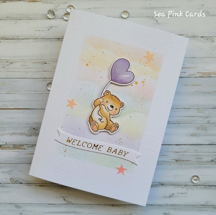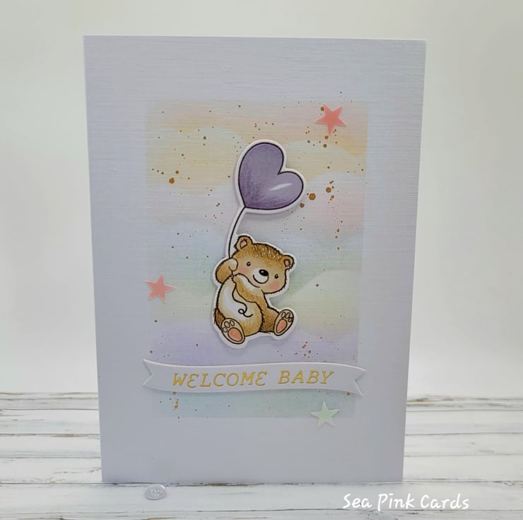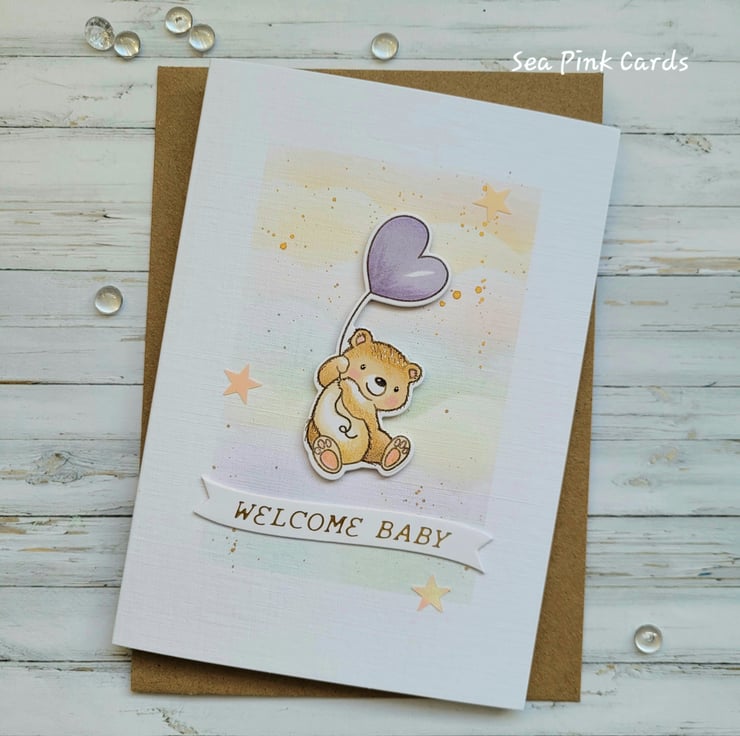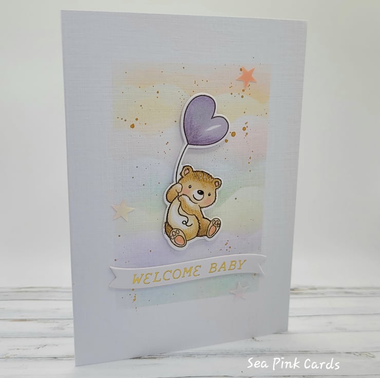 A congratulations card for a new baby, with an adorable teddy and a heart balloon. The card is handcrafted from recycled white linen cardstock and the image is handstamped and coloured with art pens and pencils. The teddy and balloon are die-cut and popped up on slim foam pads. Measuring 10.5 x 15 cms it comes with a 100% recycled brown kraft envelope. Details are added with fineliners and gold metallic watercolour. There are three small shimmery stars and the background has been created with archival inks and brushes for a cloudy effect.
