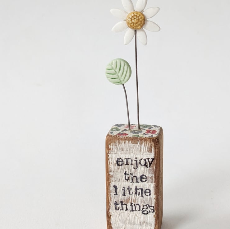 Clay Daisy Flower in a Printed Wood Block 'Enjoy the little things'