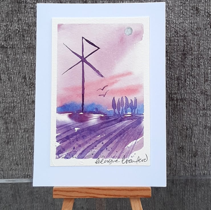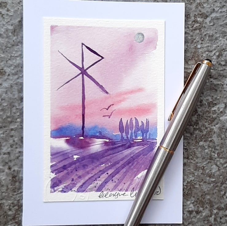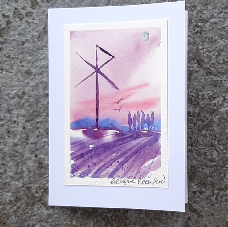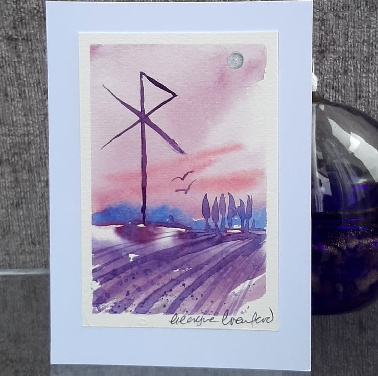 A handpainted Watercolour card with the symbol for love and affection. The symbol is grounded in the landscape.