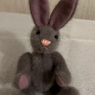 Blu is just six inches and completely hand sewn from German mohair. He is one of a kind collectable bear unsuitable for children under thirteen years of age due to components used in his construction. He has black glass eyes fully jointed and filled with fibre and steel shot to give some weight. His paws and pads are a light blue very short and soft fur. He wears a narrow ribbon tie.