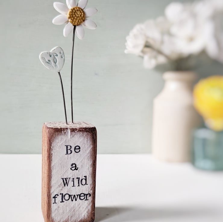 The front of the wooden block is hand stamped with the words 'Be a wild flower'