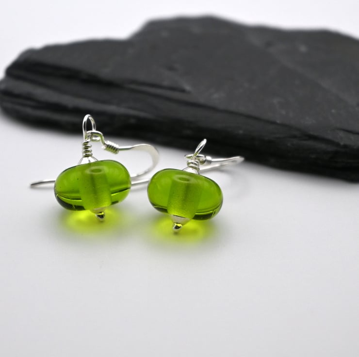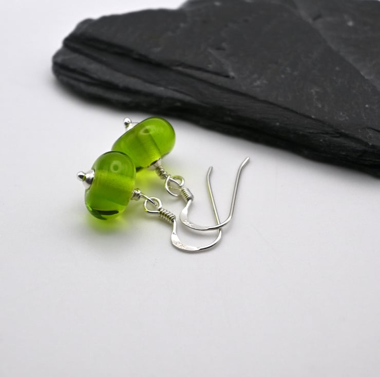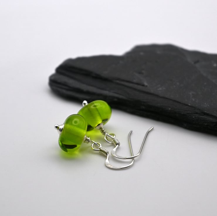 A pair of sterling silver earrings which feature handmade lampwork glass green beads.