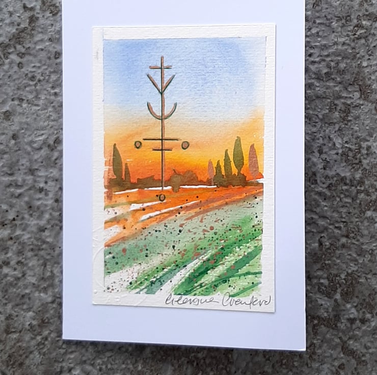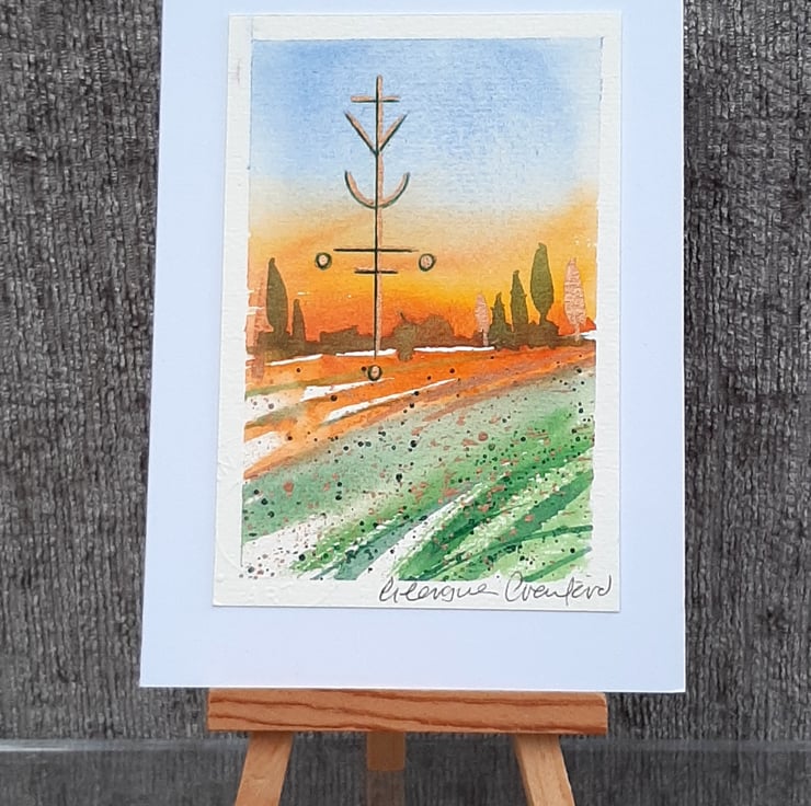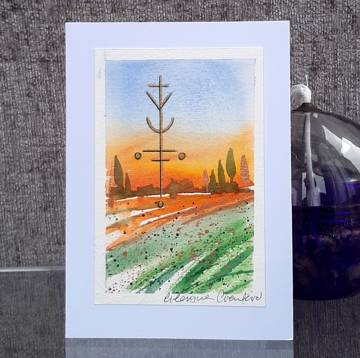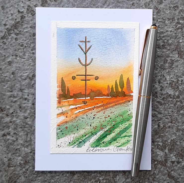 A handpainted Watercolour card with the symbol for fortune and Good luck. The symbol is grounded in the landscape.