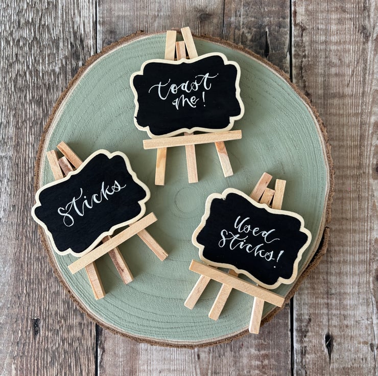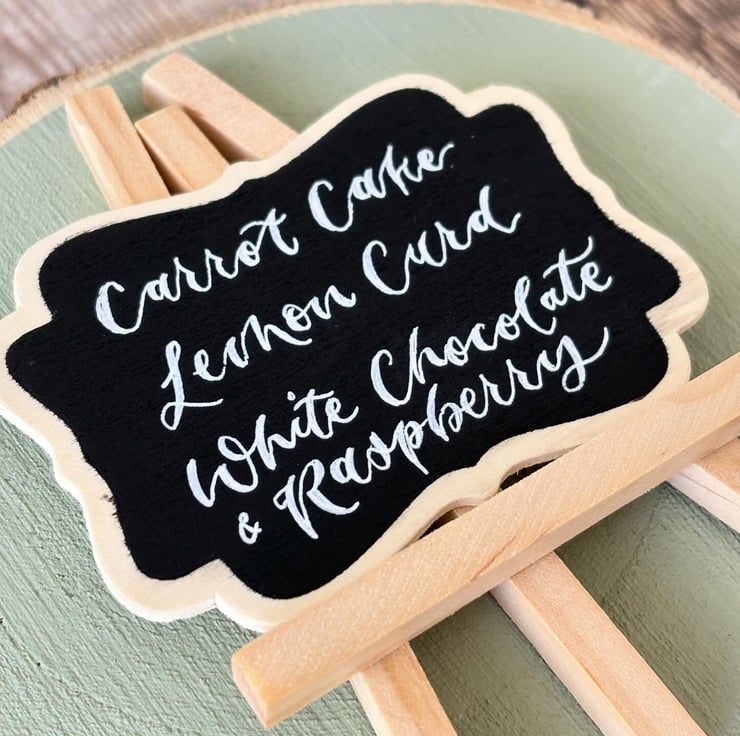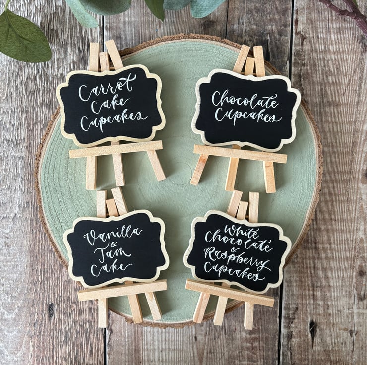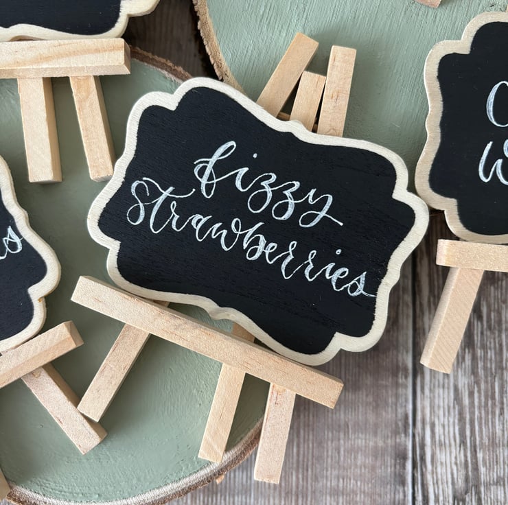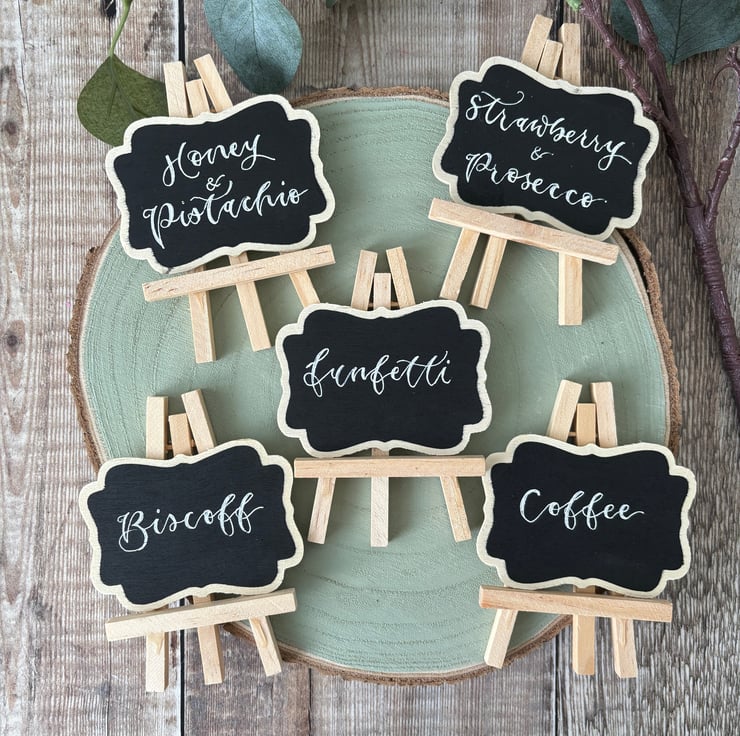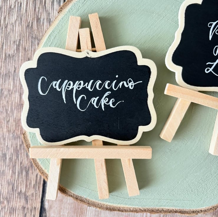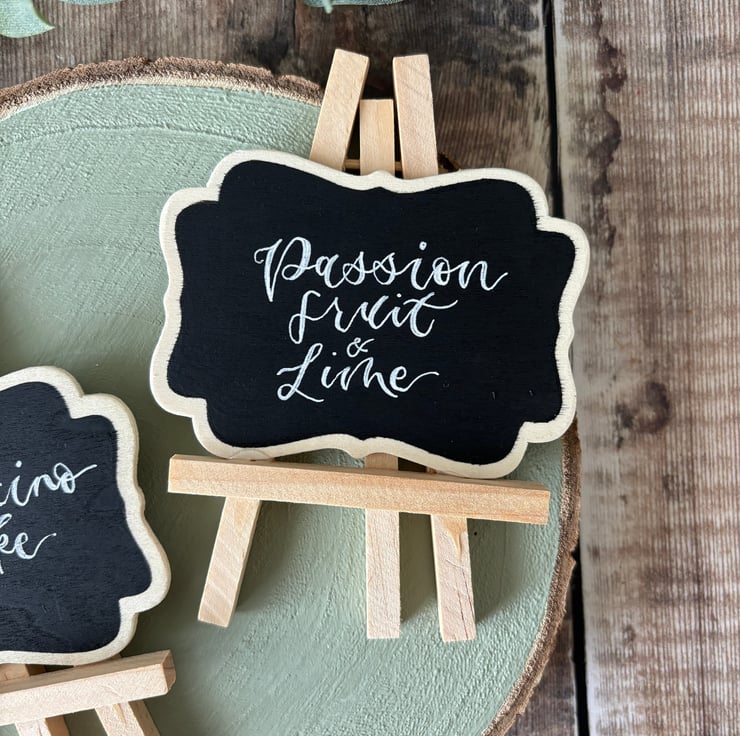 Hand lettered mini chalkboard easels in natural finish using a white pen (no vinyl)