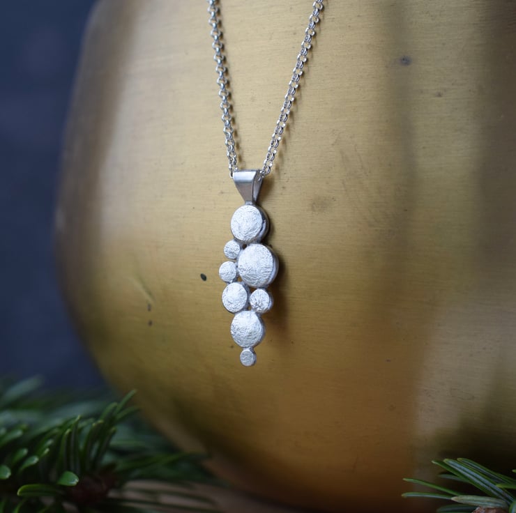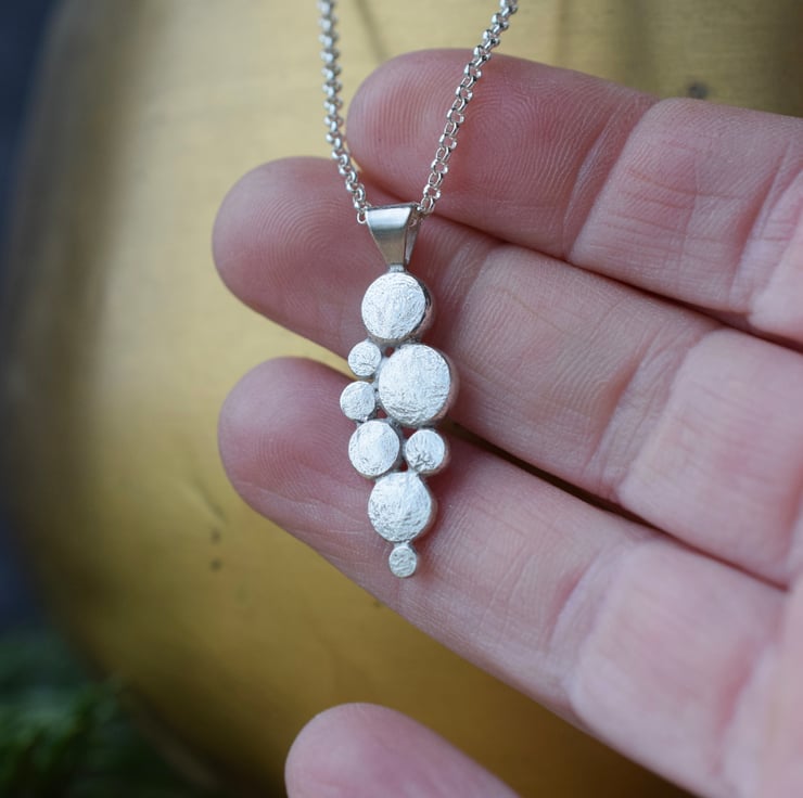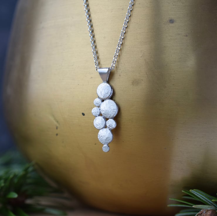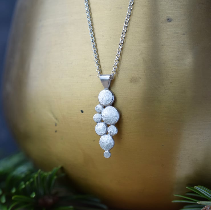 This sterling silver (925) drop necklace features hand-textured silver pebbles clustered to reflect a coastal walk.