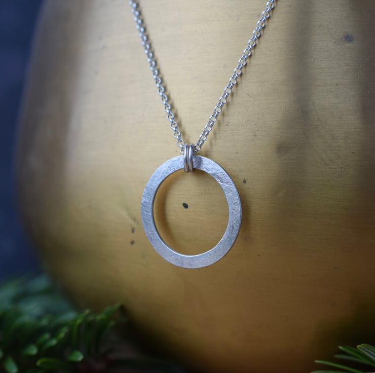 This sterling silver necklace has been hand textured to create a minimalist, circle design to elevate your everyday look. It comes hung from a sterling silver belcher chain in your preferred length.