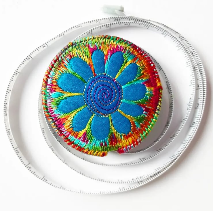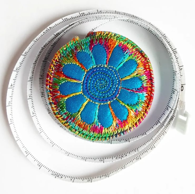 This is a handmade machine stitched fabric sewing tape measure