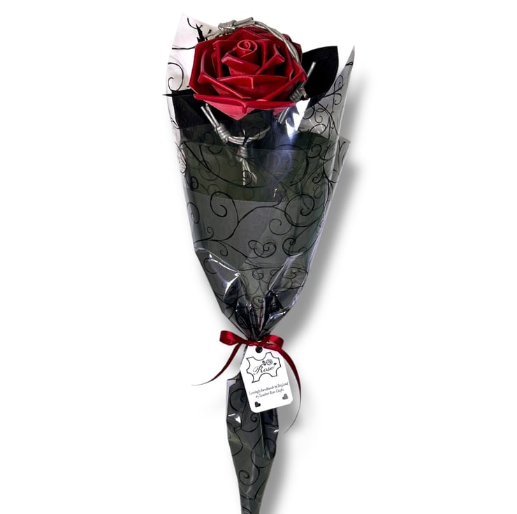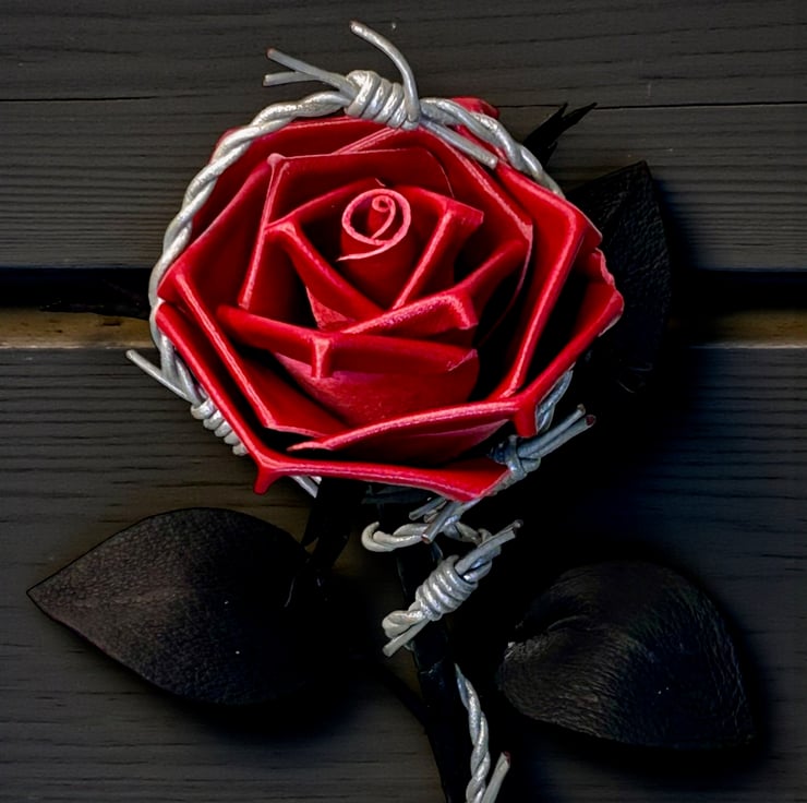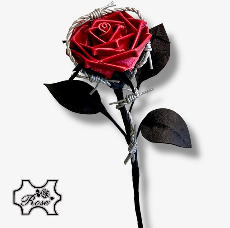 Dark red leather rose with realistic silver leather barbed wire twisted around black leather leaves and stem. This gothic leather rose is a powerful symbol of dark romance, devotion, protection and forbidden love.