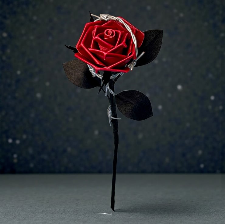 Each rose is completely unique. Every time I make one, the barbed wire cord twists in a different way meaning no two roses are ever the same!