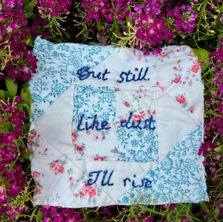 A hand embroidered quote by Maya Angelou stitched onto a fragment of vintage quilt. This hand stitched piece honours the quiet strength found in both old threads and timeless words. It gives new life to heritage fabric, sustainably transforming a fragment of the past into a unique work of art for your home.