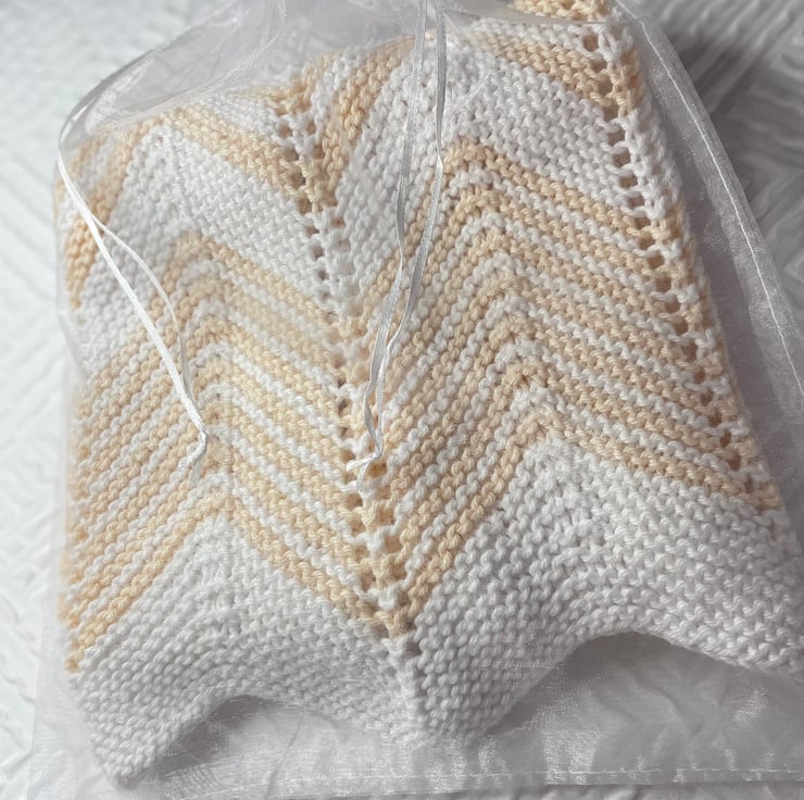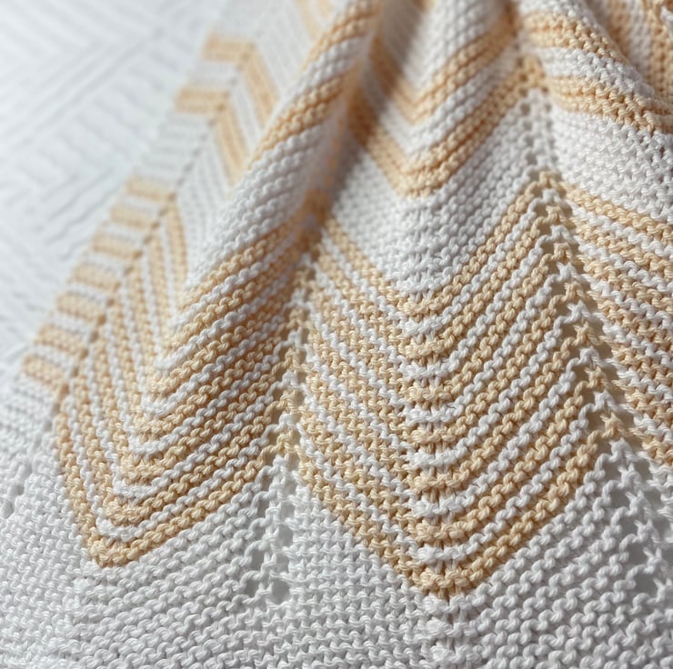 Pretty chevron striped baby blanket in crisp white with a neutral buttermilk stripe. Measures 60 x75cm making it the perfect size for pram crib or Moses basket.