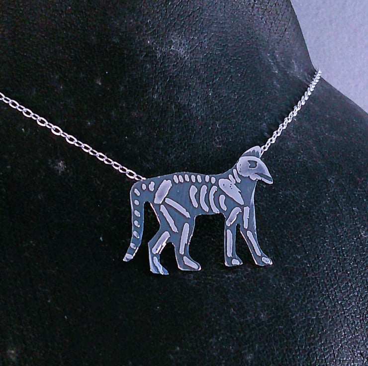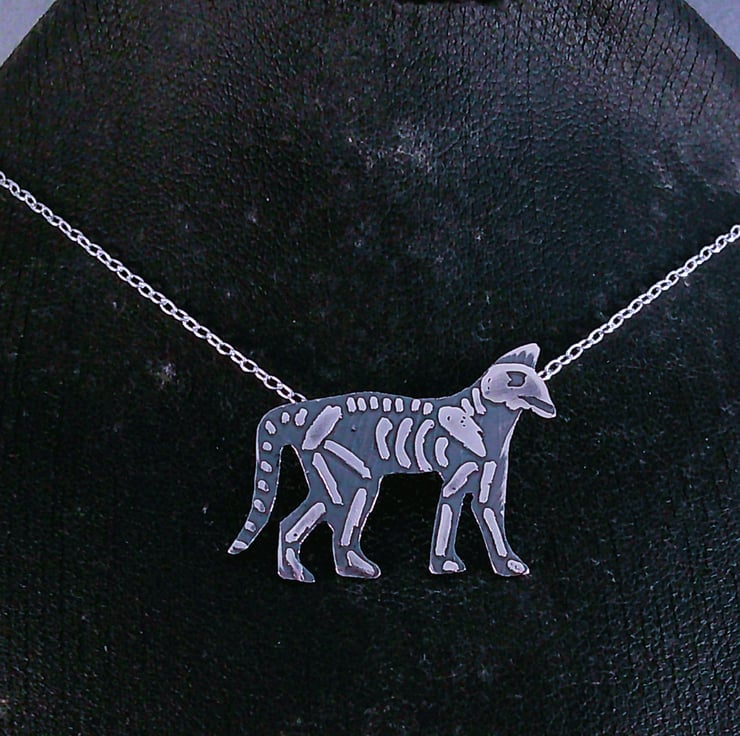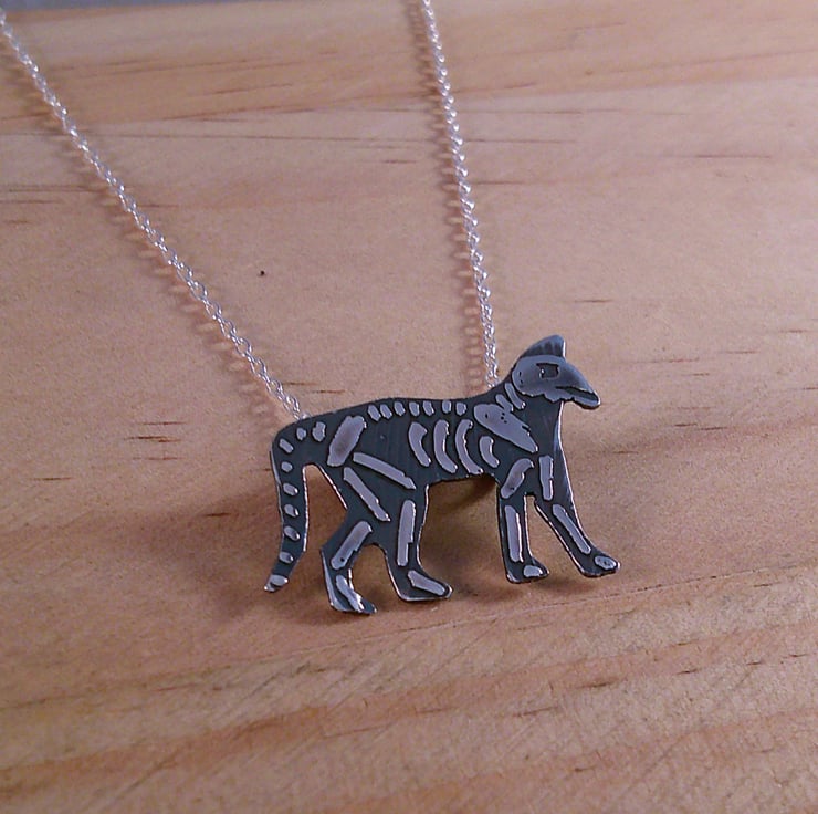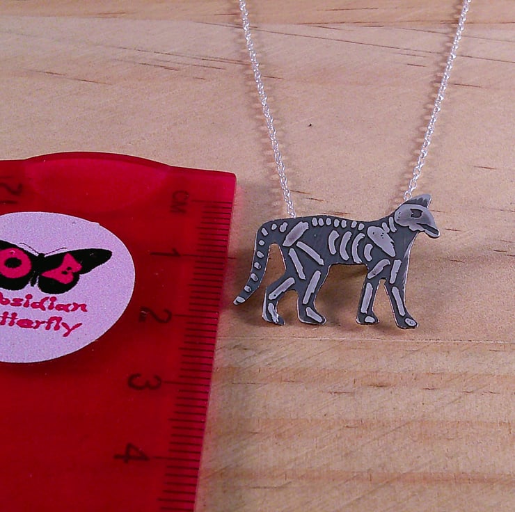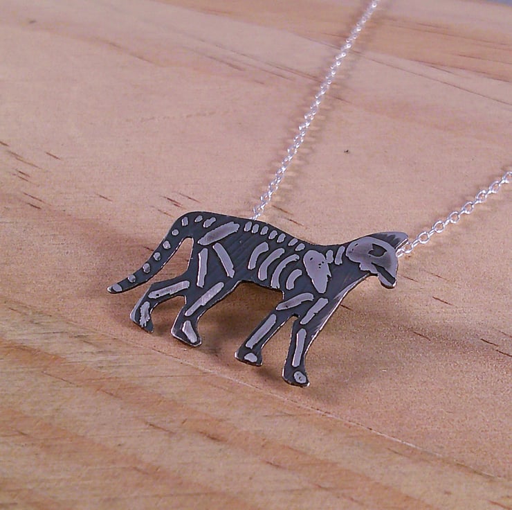 The shape of the cat has been hand pierced from a sheet of 100% recycled sterling silver. The details of the cat skeleton has been hand drawn and etched. Two loops have been soldered to the back for the chain and then the necklace has been oxidised to blacken the etched details.