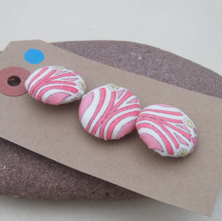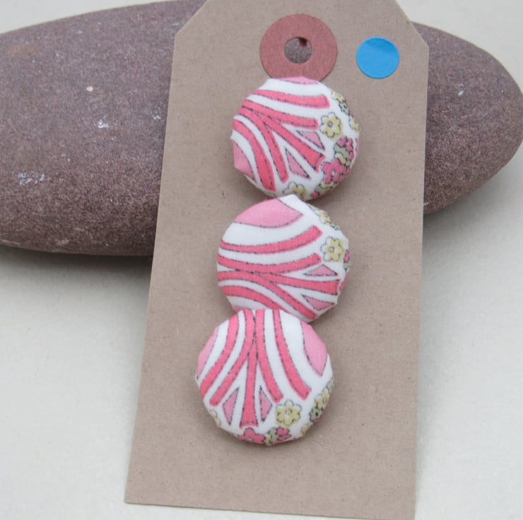 Set of 3 handmade fabric buttons, 2.4cms diameter on a white nylon base and shank.