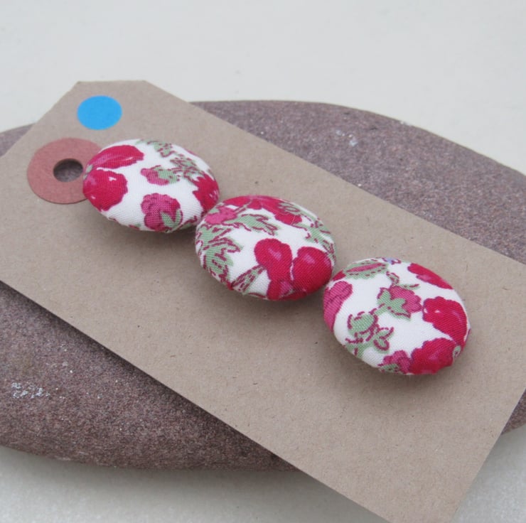 Set of 3 handmade fabric buttons, 2.4cms diameter on a white nylon base and shank.