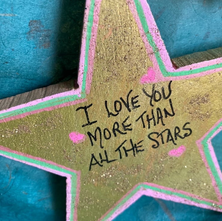 This wooden hanging gold star has the words I LOVE YOU MORE THAN ALL THE STARS. A pretty romantic gift for the one you love.