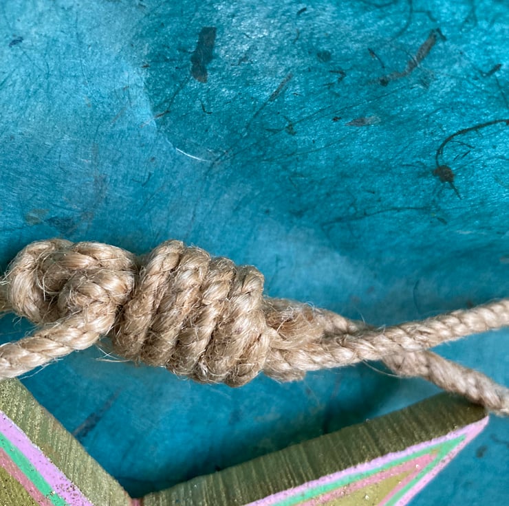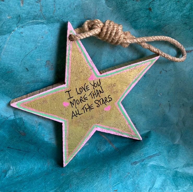 It is painted all over in gold with a pink and blue painted trim around the edges. There are 3 little pink hearts beside the written words. It has been varnished all over with an addition of gold shimmer. A pink heart has been painted on the back. A strong twine rope holds up this star.