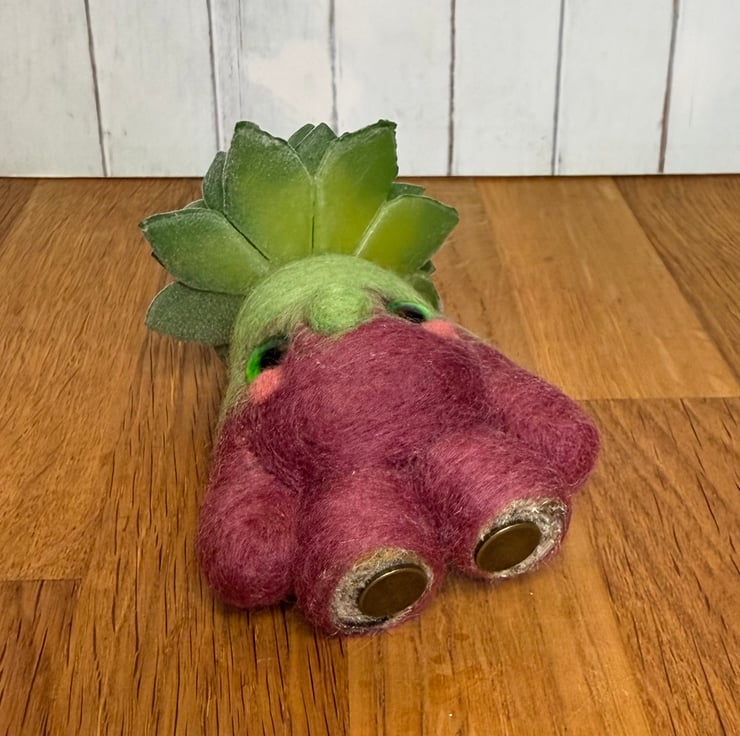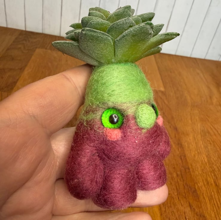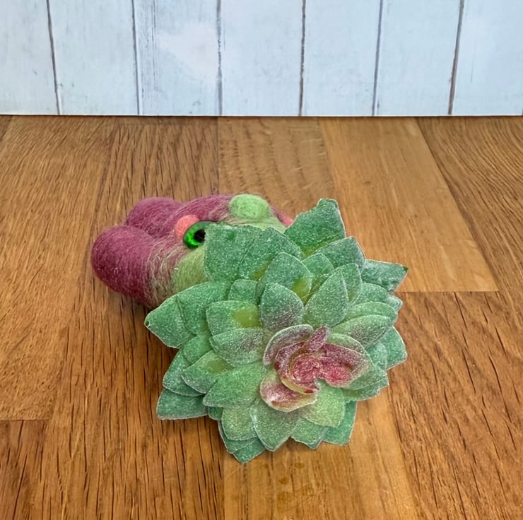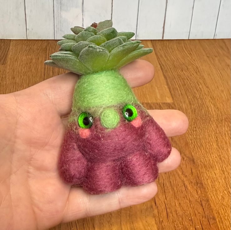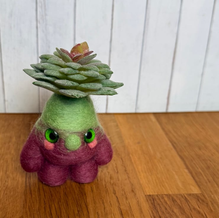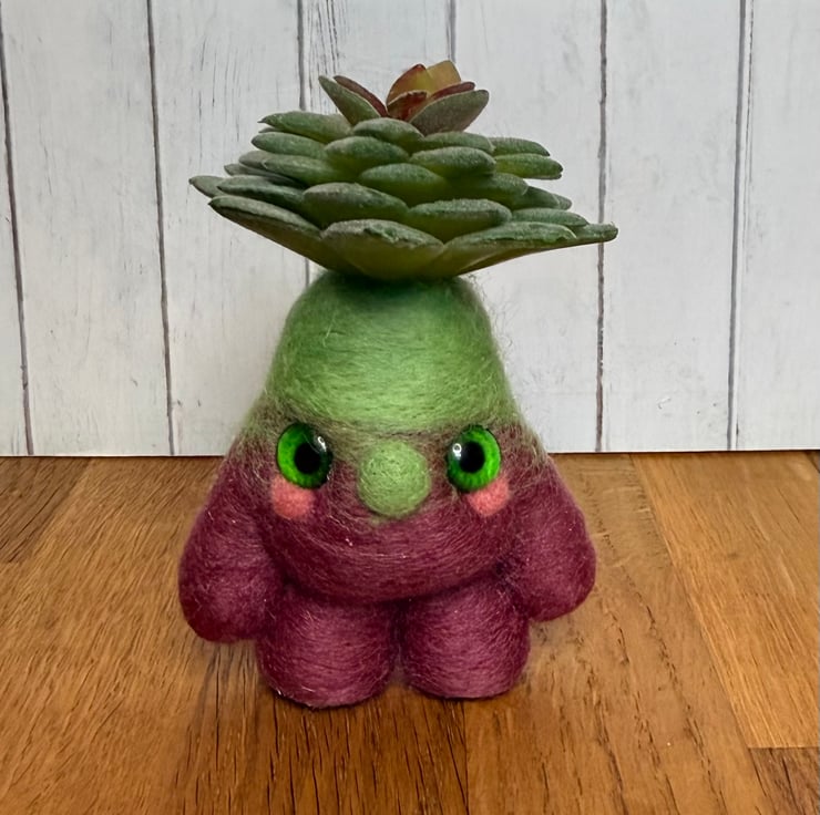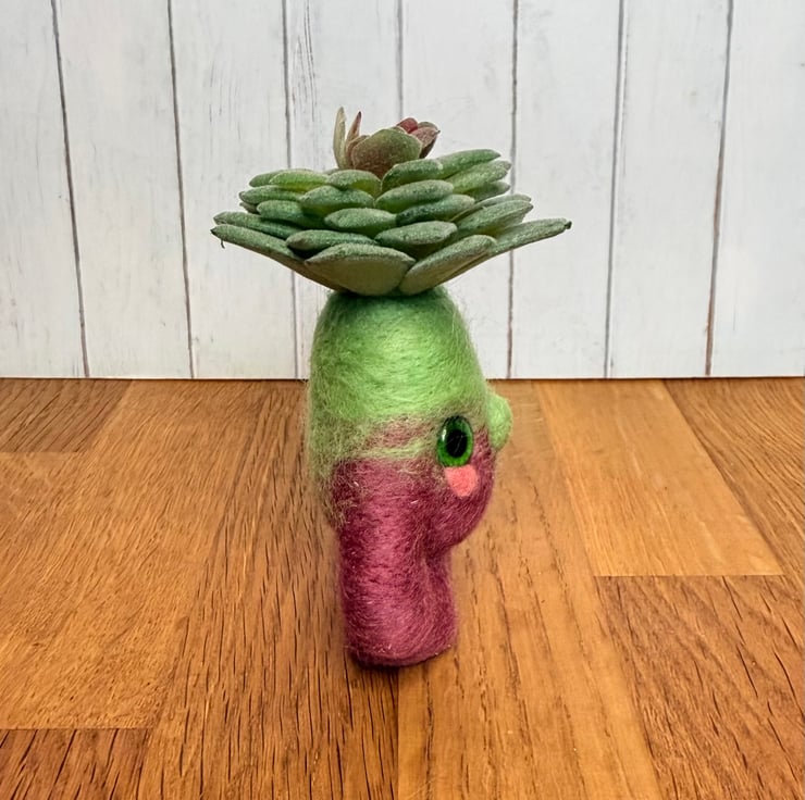 Decorative gnome doll needlefelted with hand dyed wool. This little cutie measures roughly 10cm tall and has pretty glass eyes and faux Succulent plant atop its head. This doll should stand unaided due to flat pins in the feet. This unique doll is made for decorative purposes only and not a toy. Sent in recycled or recyclable packaging.