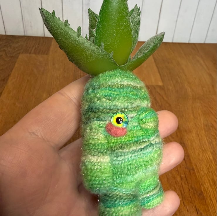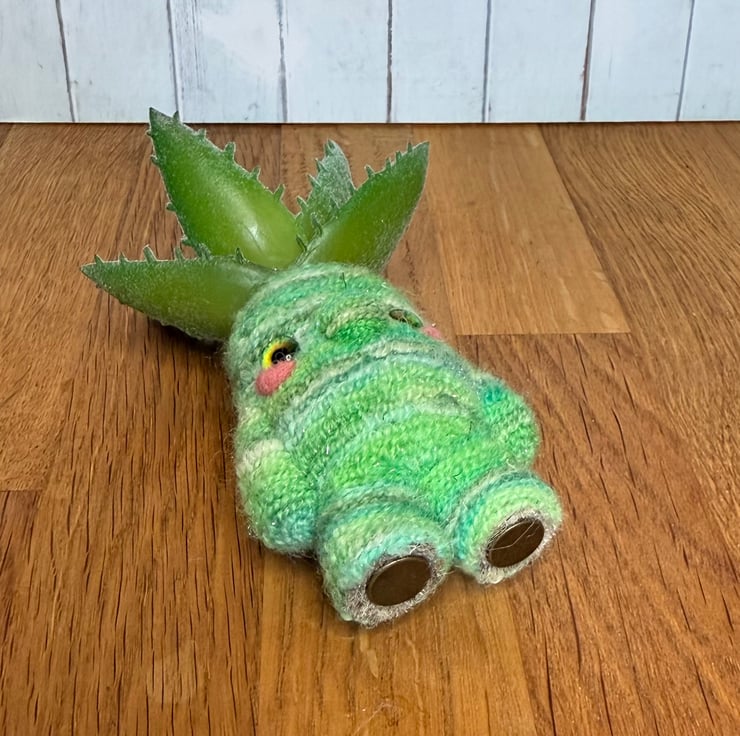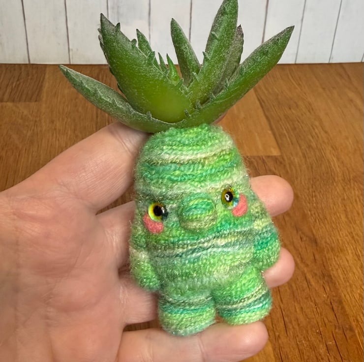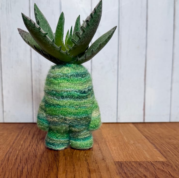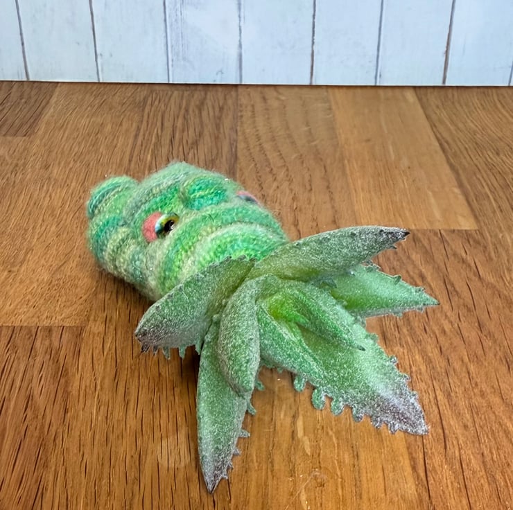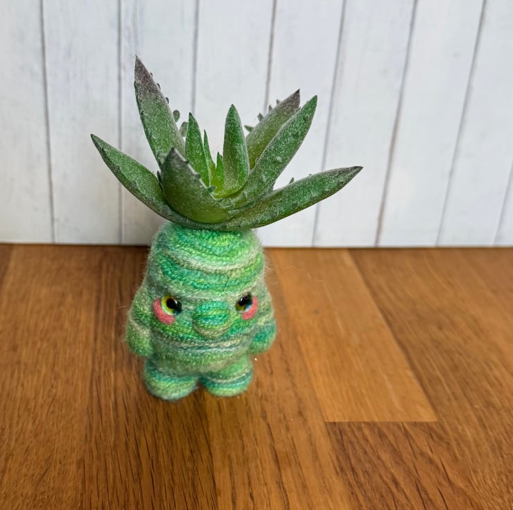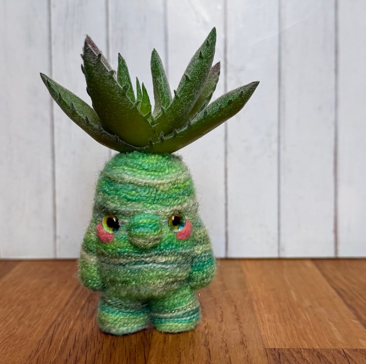 Decorative gnome doll needlefelted with hand dyed multi tonal green yarn with shimmery flecks. This little cutie measures roughly 11cm tall and has pretty glass eyes and faux Succulent plant atop its head. This doll should stand unaided due to flat pins in the feet. This unique doll is made for decorative purposes only and not a toy. Sent in recycled or recyclable packaging.