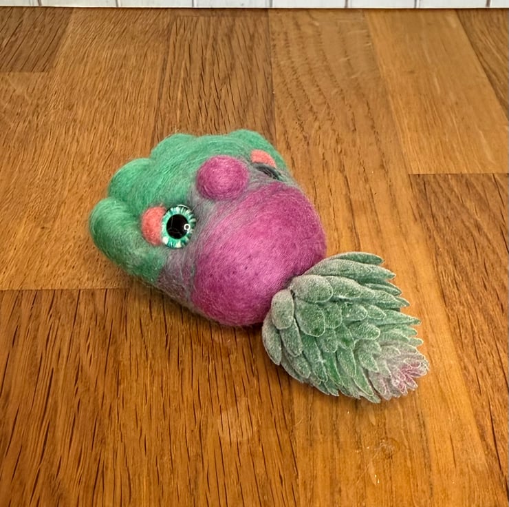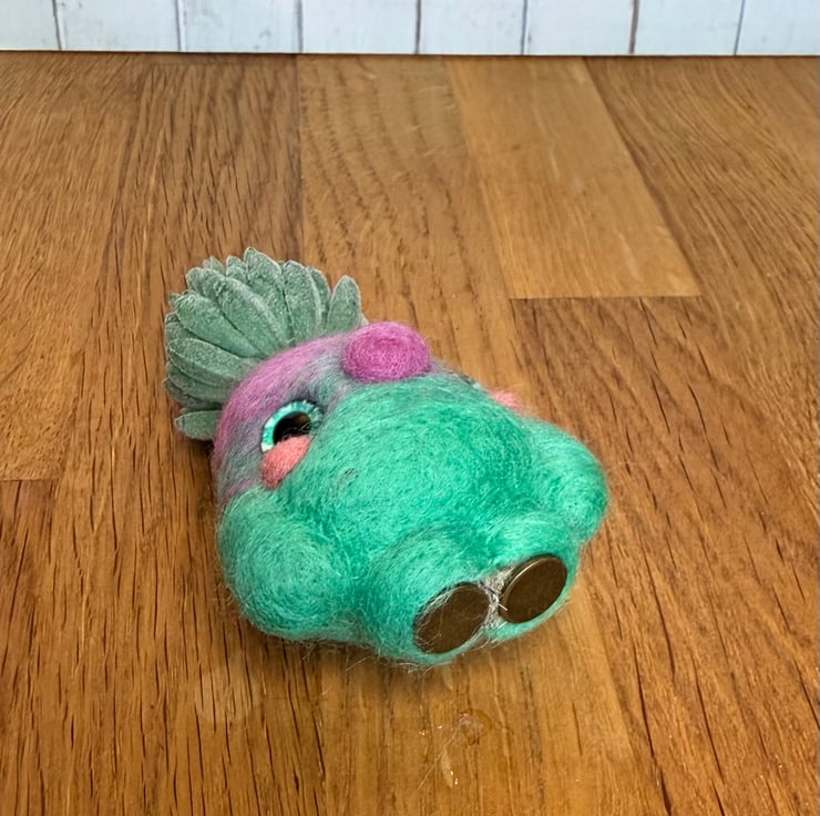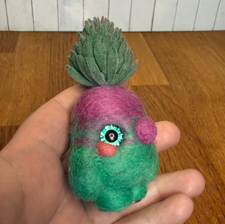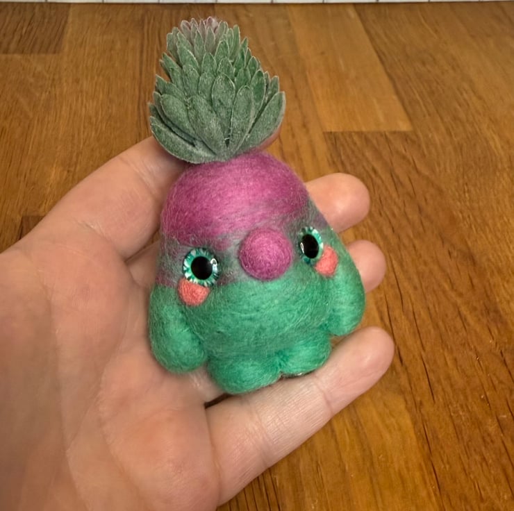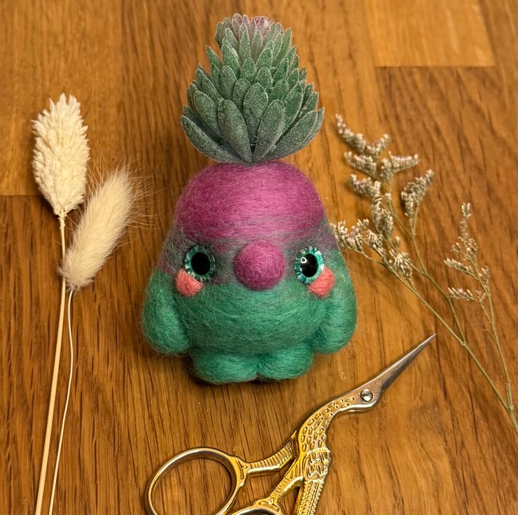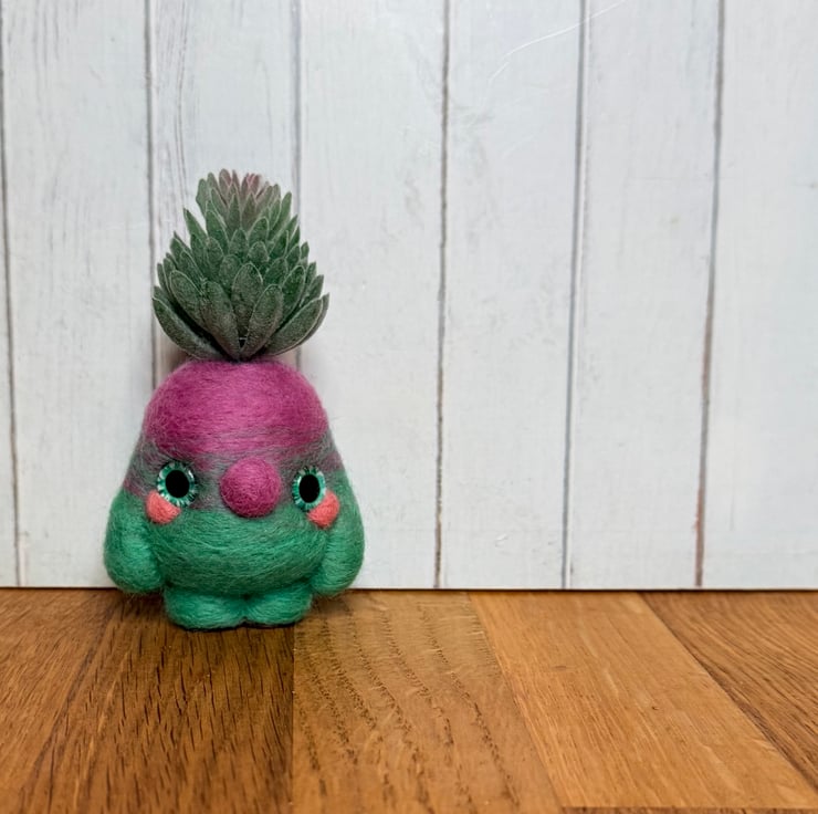 Decorative gnome doll needlefelted with hand dyed wool. This little cutie measures roughly 9.5cm tall and has pretty glass eyes and faux Succulent plant atop its head. This doll should stand unaided due to flat pins in the feet. This unique doll is made for decorative purposes only and not a toy. Sent in recycled or recyclable packaging.
