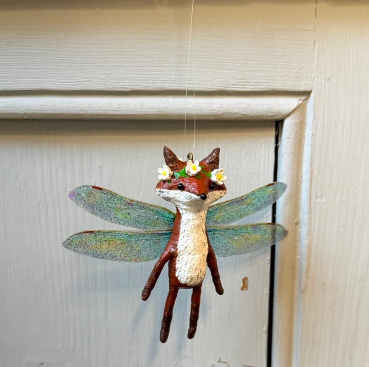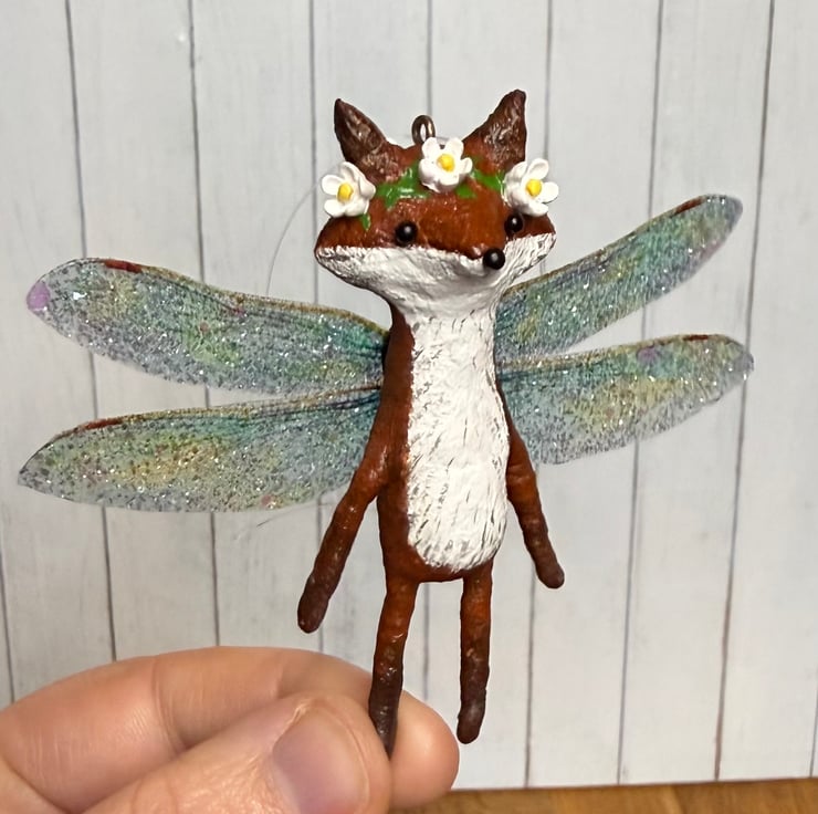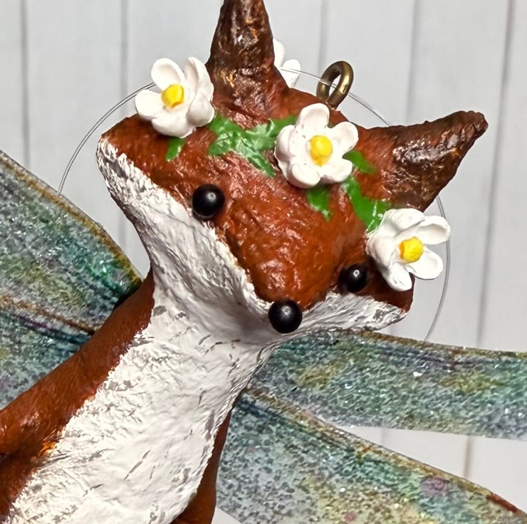 Whimsical art doll decorated with tiny daisy flowers and entirely hand painted. This spun cotton fox has a white chest and glass bead eyes and nose. The wings are printed plastic. Fox fairy measures roughly 8cm tall with a 10cm wingspan and catches the light beautifully, its glitter casting sparkles across the room. This is for decorative purposes only and not a toy. Sent in recyclable or recycled packaging. Comes with transparent loop hanger.