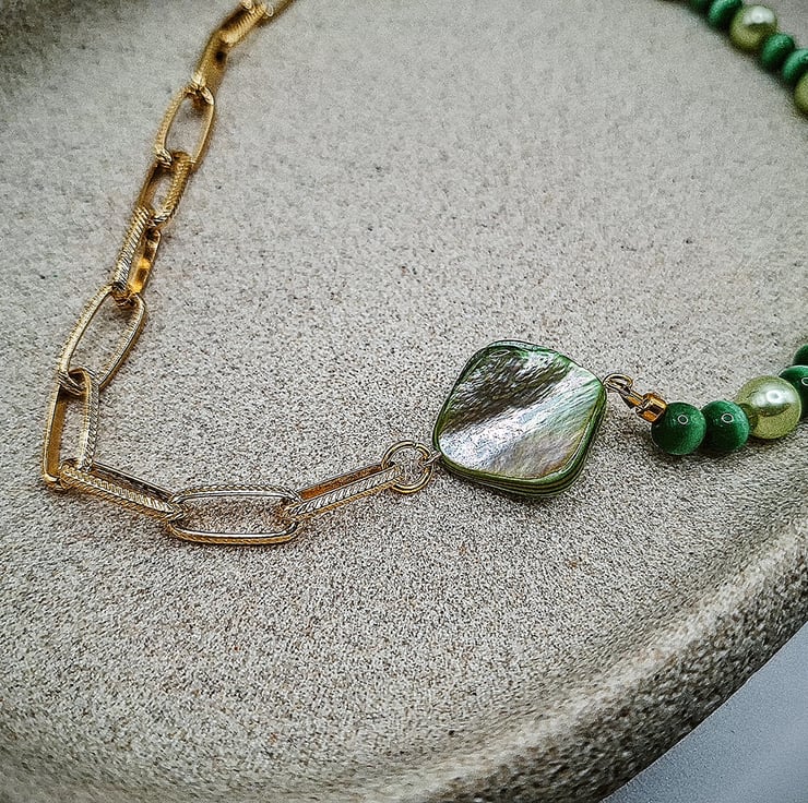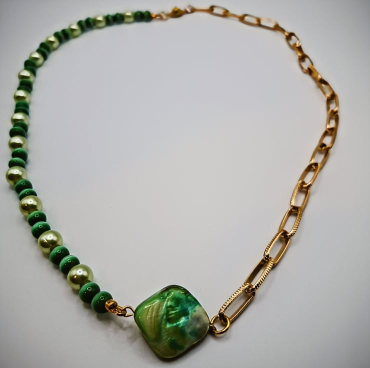 One of a kind, original and recycled asymmetrical necklace. A simple mix of soft green beads, a bold marbled stone, and a touch of gold for an easy, stylish look.