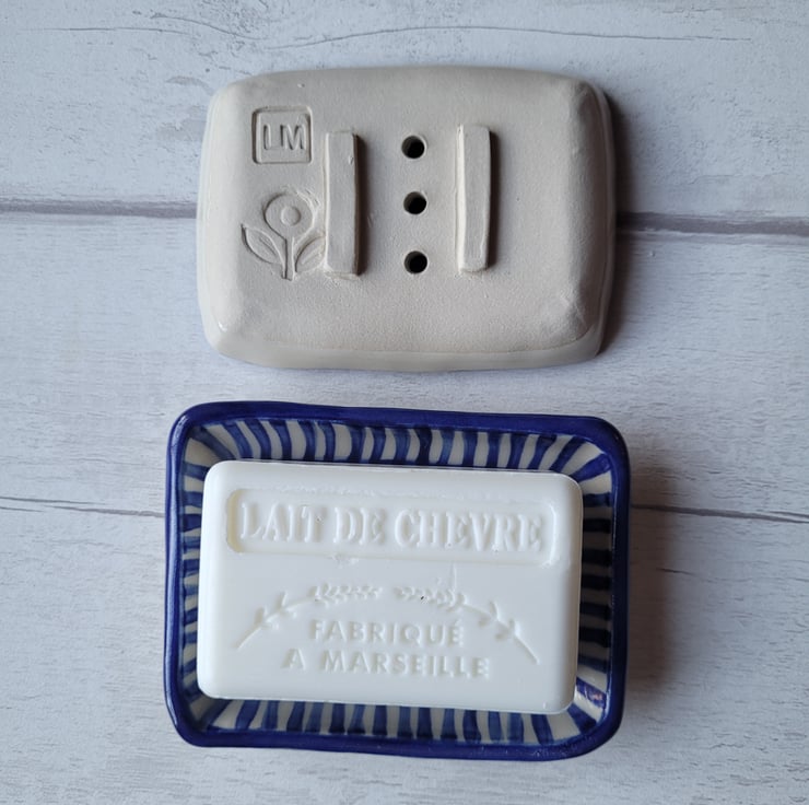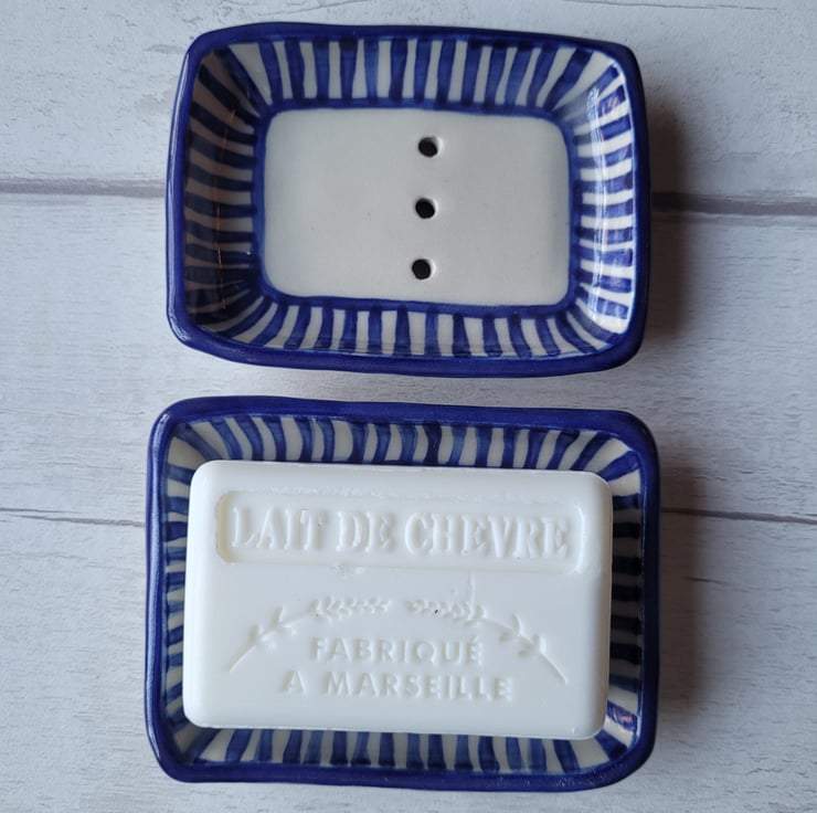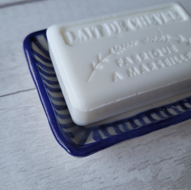 Pretty little soap dish with a blue striped edge.