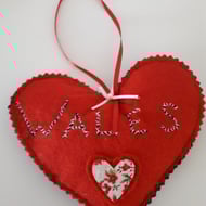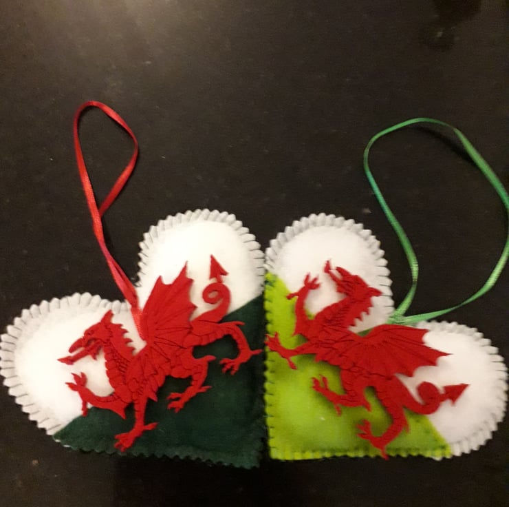 Lovely 2 x Welsh Dragon hearts to hang anywhere in the home, hand sewn using felt materials and contrasting ribbon, filled with polyester wool toy stuffing. Ideal to give as a gift.