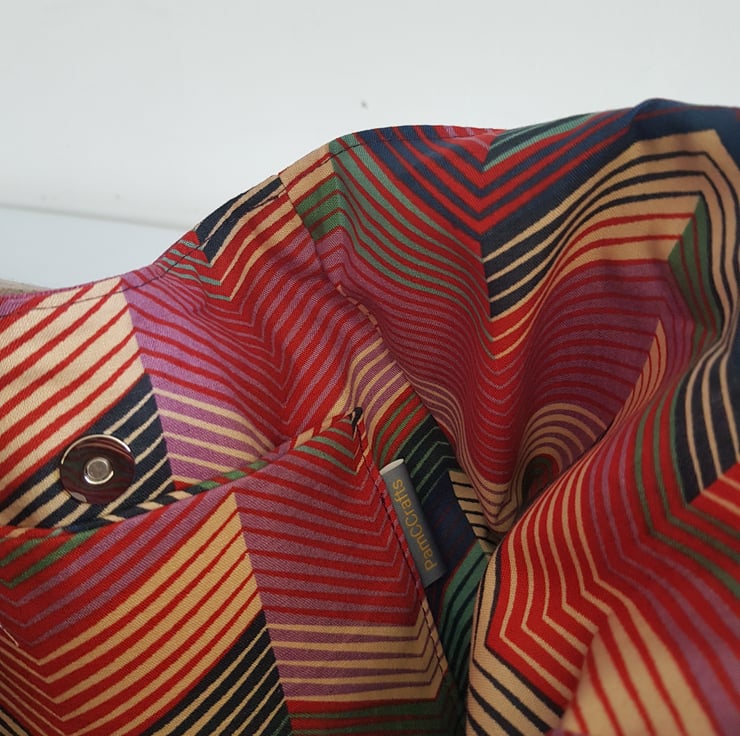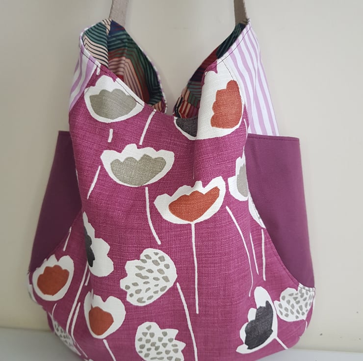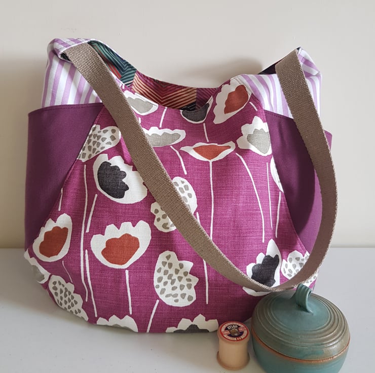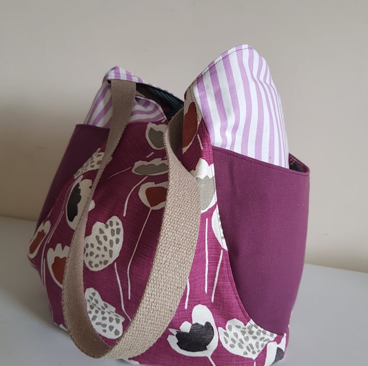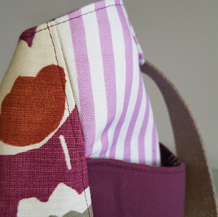 This cheerful and generous tote is made from good quality furnishing fabrics. It has 2 large side pockets and a pocket inside and it is fully lined. It is more detailed and challenging to make than my more simple totes, but it is a pattern I come back to again and again. I love coordinating the fabrics, and the generous side pockets. The outer fabrics are interfaced with a woven cotton to give additional strength