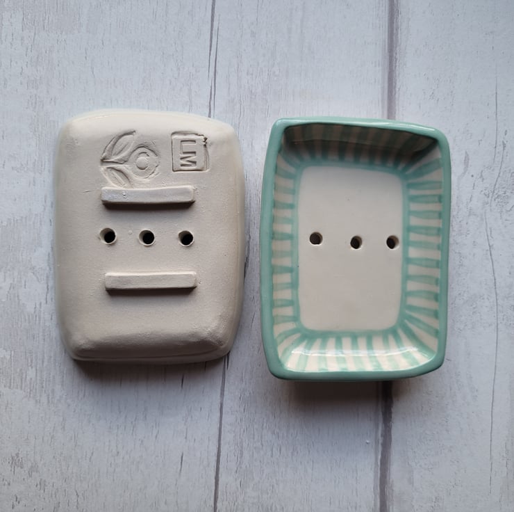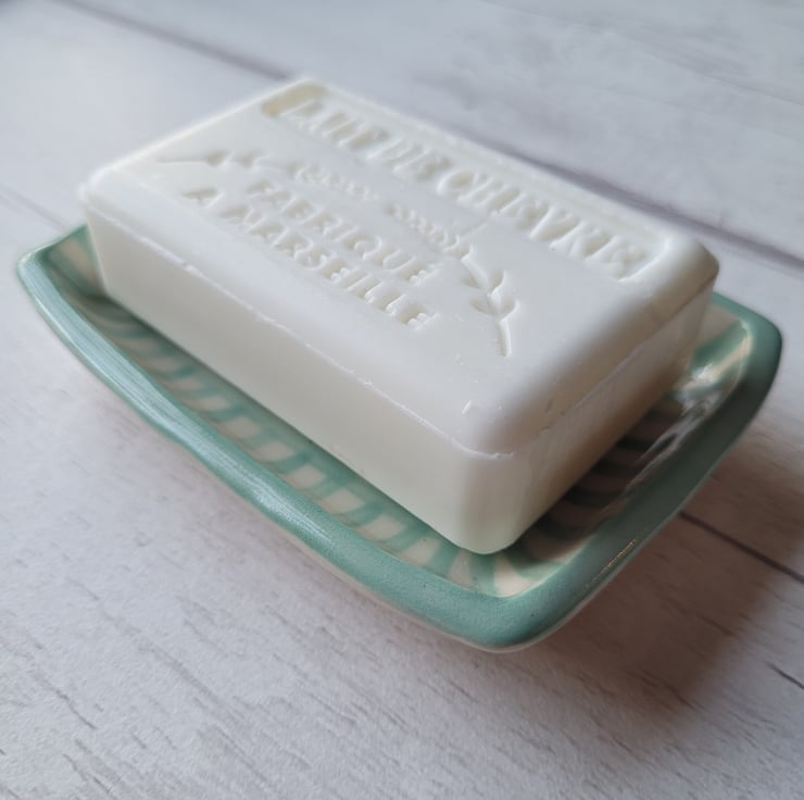 These dishes are small enough to fit on the edge of your sink, big enough for a small bar of soap! They have 3 drainage holes.