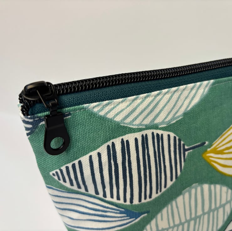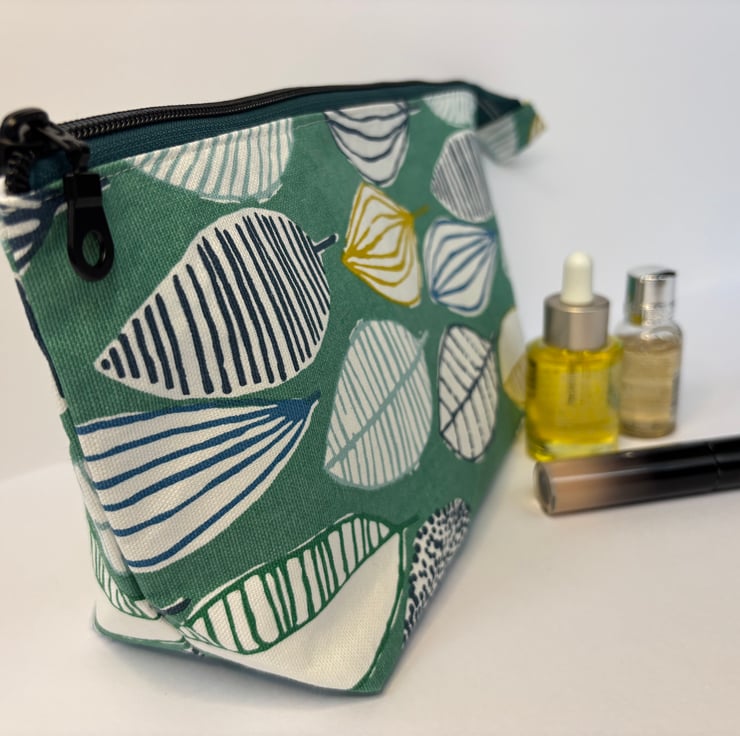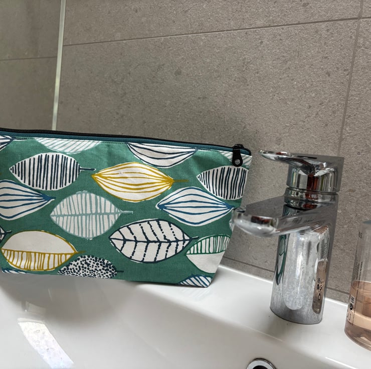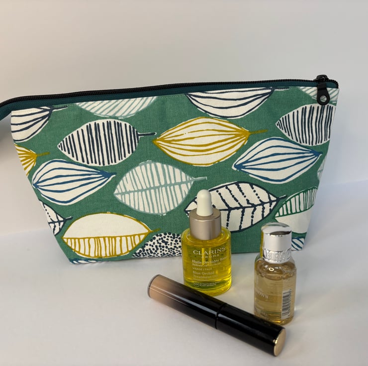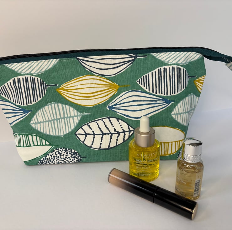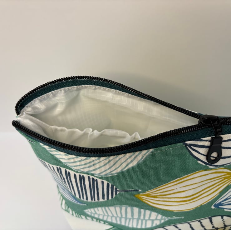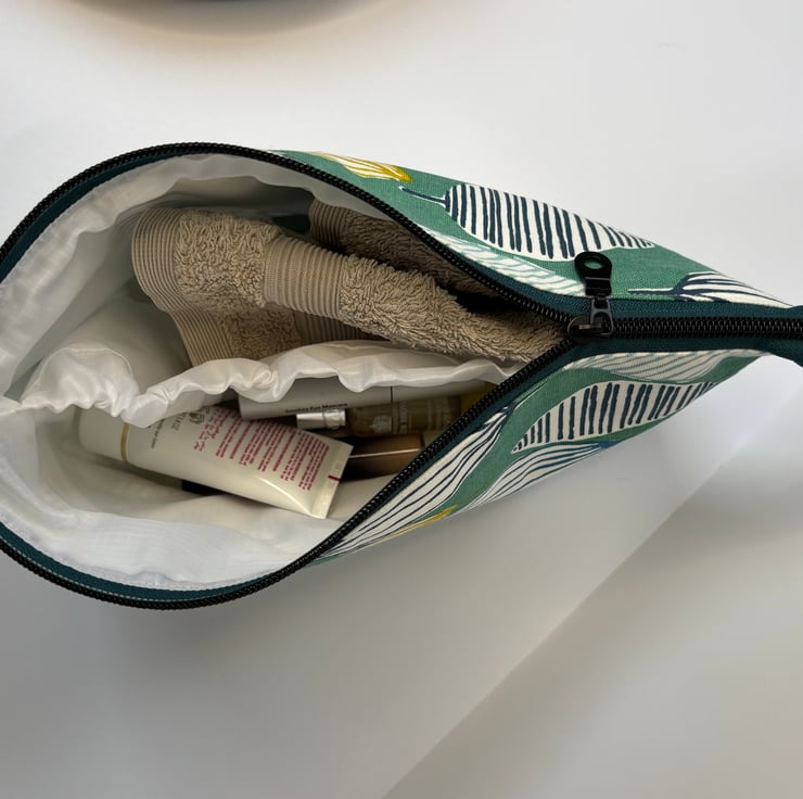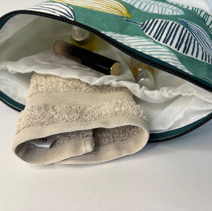 This wash bag is made from a cotton print fabric on the exterior, in a lovely, rich green with images of leaves. It is lined with a white water-resistant ripstop. There is a gently elasticated divider inside the bag - useful for separating a wet flannel or cloth from the rest of your items.