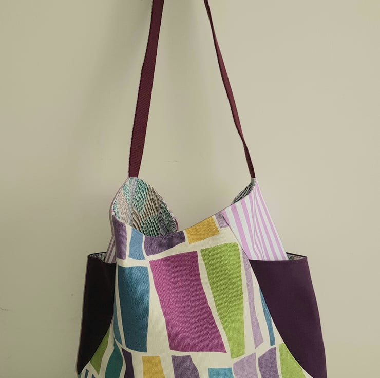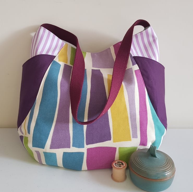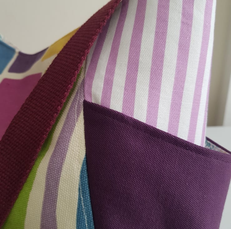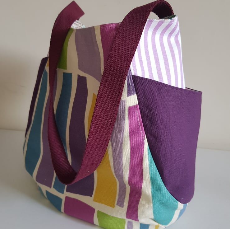 This cheerful and generous tote is made from good quality furnishing fabrics. It has 2 large side pockets and a pocket inside and it is fully lined. It is more detailed and challenging to make than my more simple totes, but it is a pattern I come back to again and again. I love coordinating the fabrics, and the generous side pockets. The outer fabrics are interfaced with a woven cotton to give additional strength